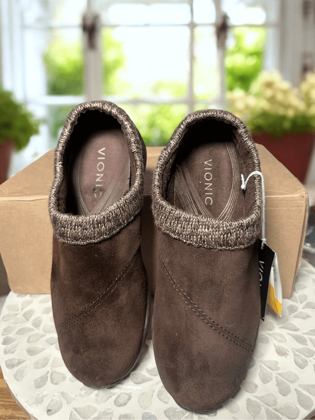 как выглядит Vionic Orthotic Water Resistant Arbor Clog Slippers Women s 6 Brown Suede Knit C фото