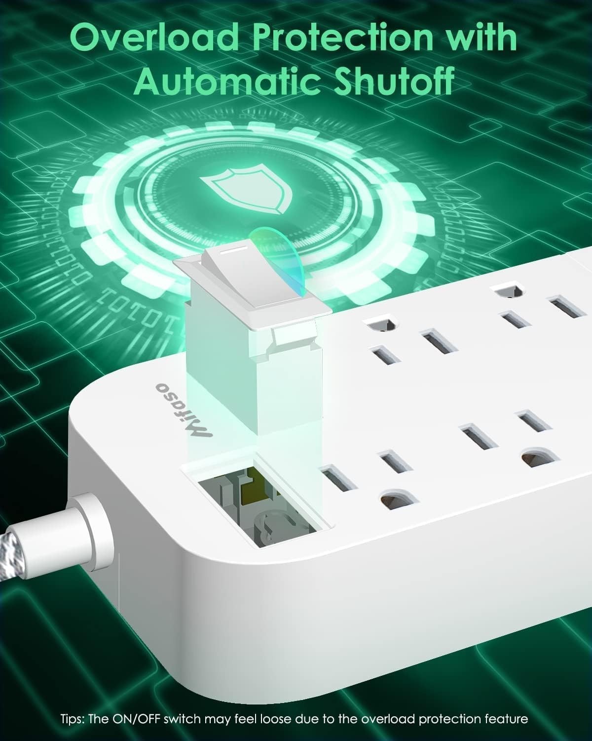 Особенности: On/Off Switch, 6 ac outlets, 3 USB A ports, Up to 2.4A charge speed, Braided extension cord, Multiple security modules, Overload protection, Short-circuit protection, Over current protection, Over-voltage protection, Overheating protection, Indicator light, Flat plug, Low profile design, Wall mountable, Two mounting holes