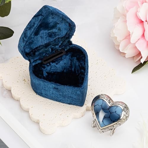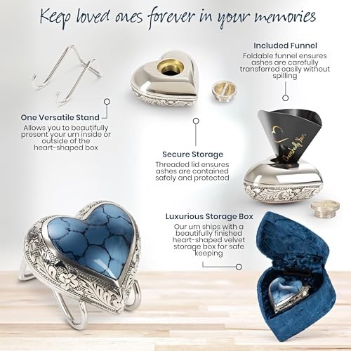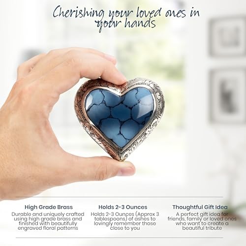 Mini Blue Heart Shaped Cremation Urn for Ashes - Keepsake Brass Urn with Velvet