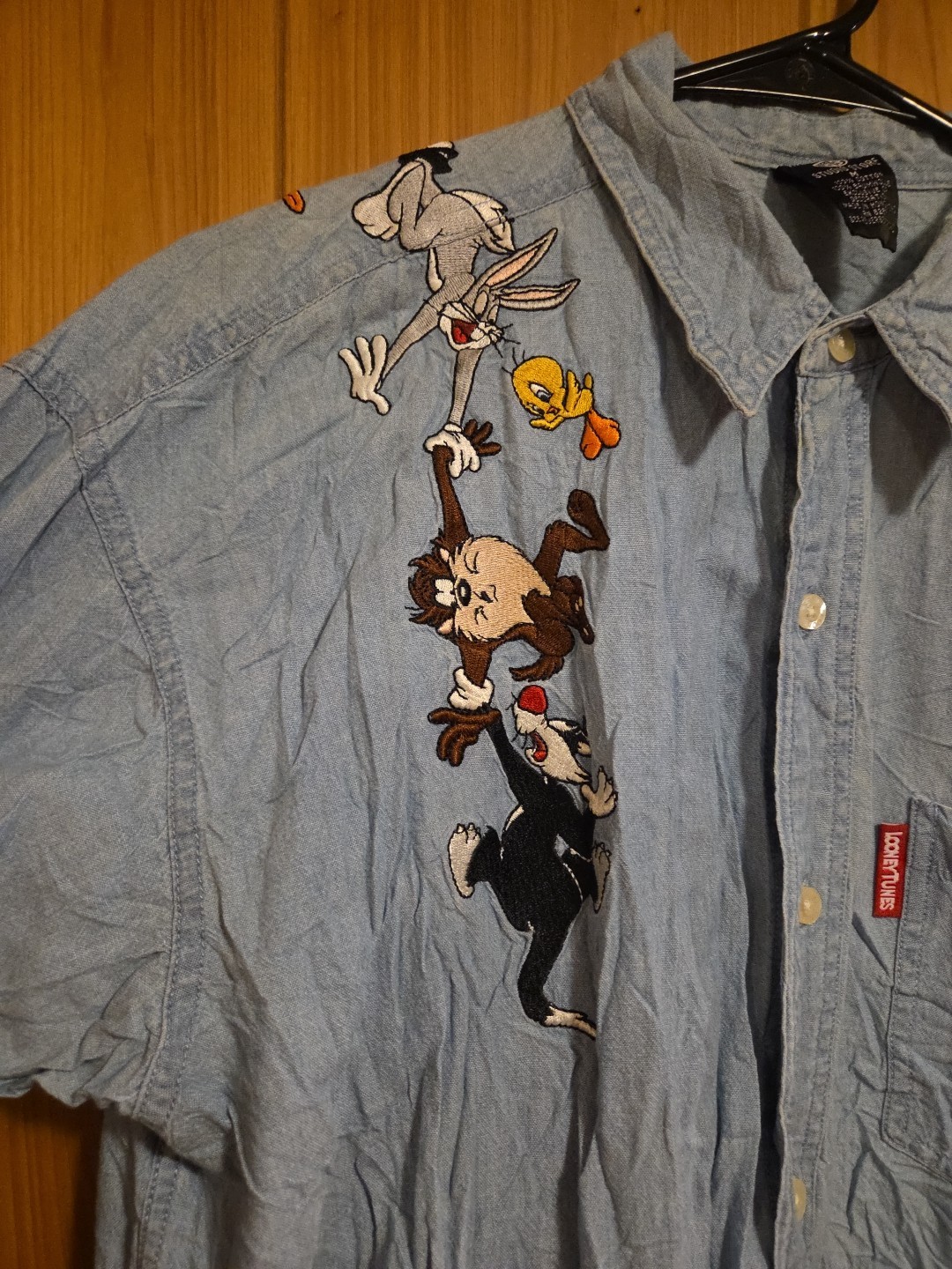 как выглядит Vintage 90s Looney Tunes Medium Embroidered Shoulder Collared Pocket Shirt 22x29 фото