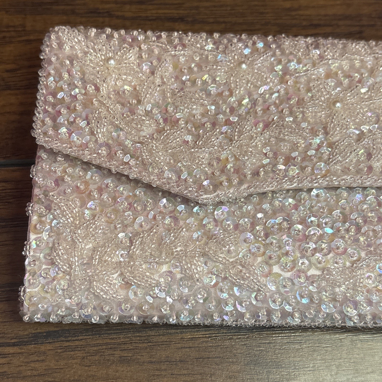 как выглядит VTG 50 s Pink Satin Iridescent Sequins Beaded Evening Clutch Purse Hong Kong фото