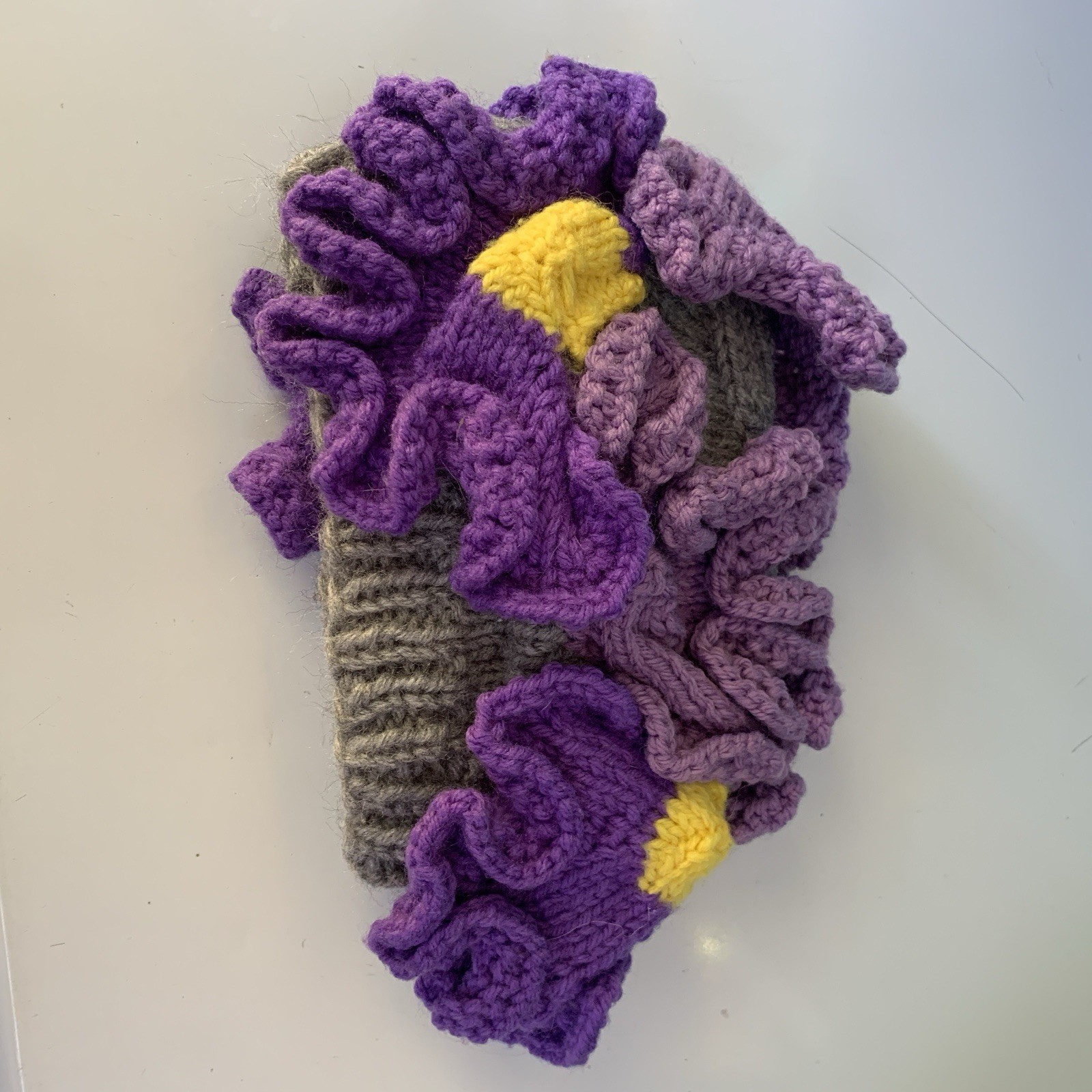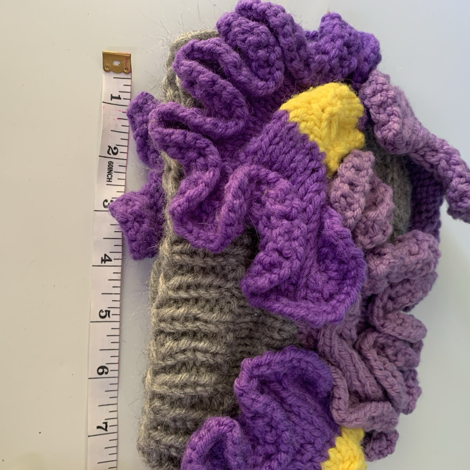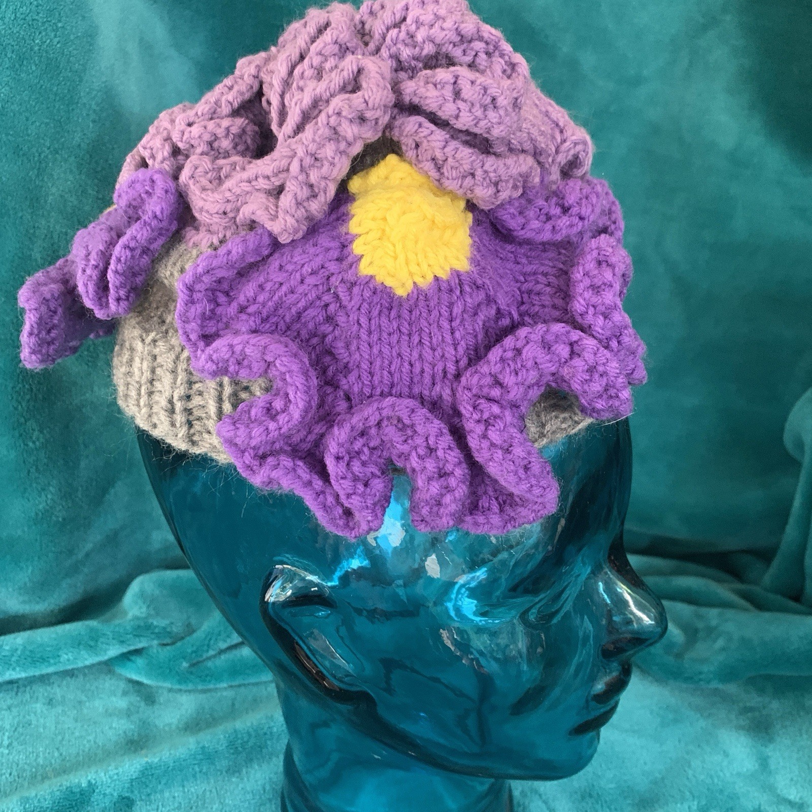 как выглядит Hand Knit Crochet Girls Hat Purple with Lavender Flowers Twee Whimsy Flower фото