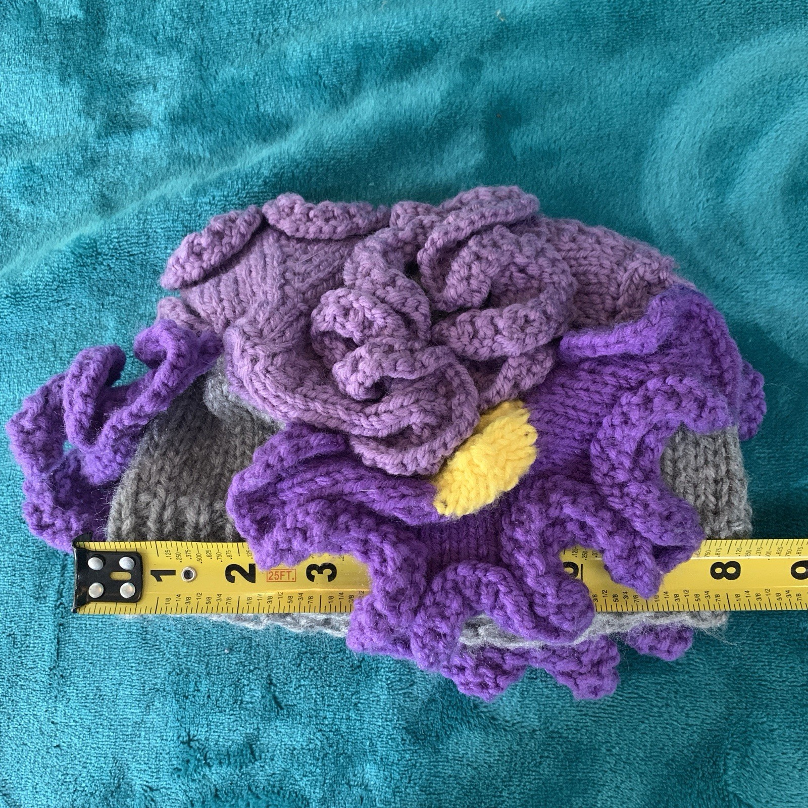 Hand Knit Crochet Girls Hat Purple with Lavender Flowers Twee Whimsy Flower