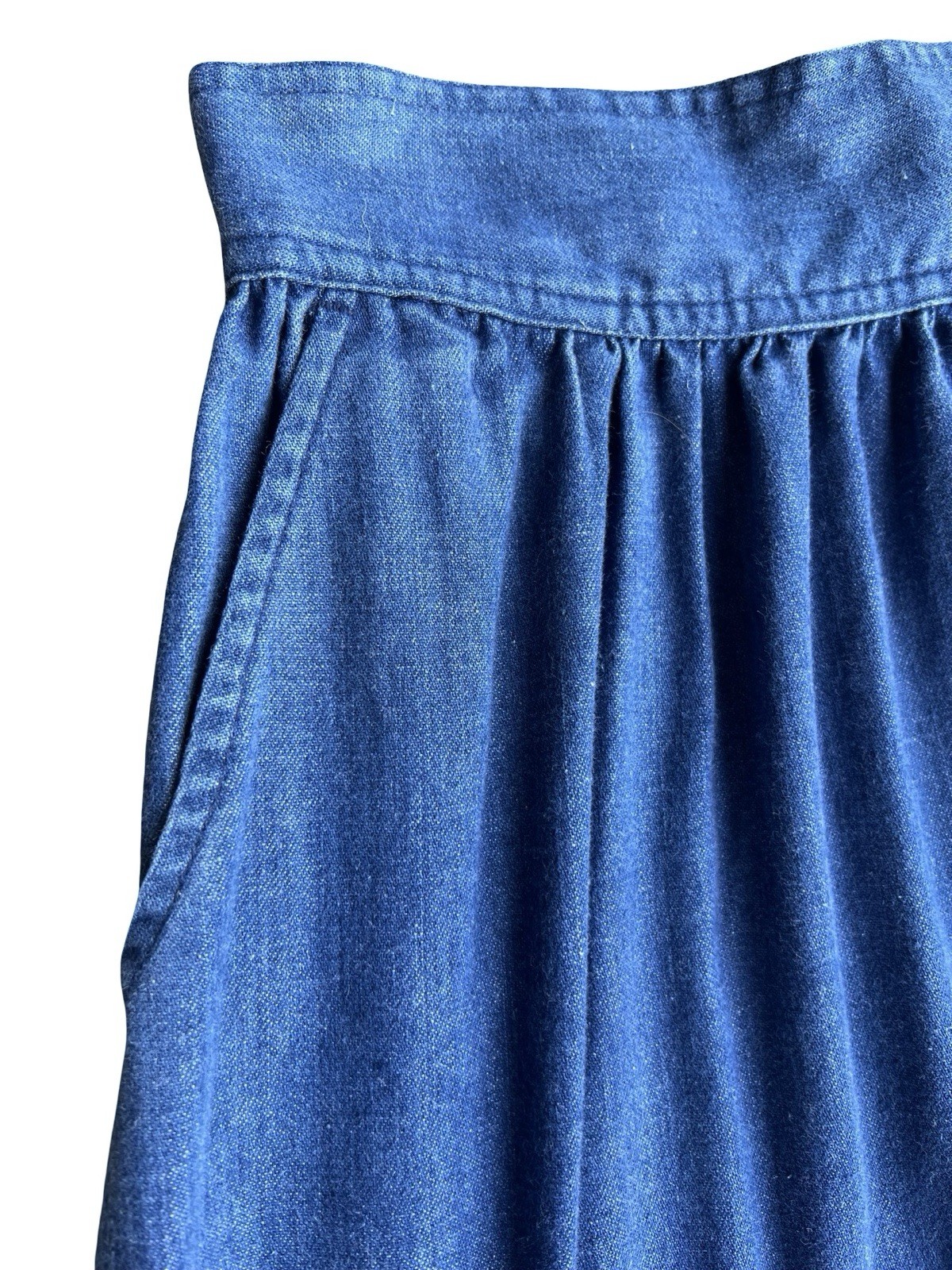 как выглядит Vintage Denim Jean Prairie Ruffle Western Midi Skirt Lace Trim Sz S Pockets Rare фото
