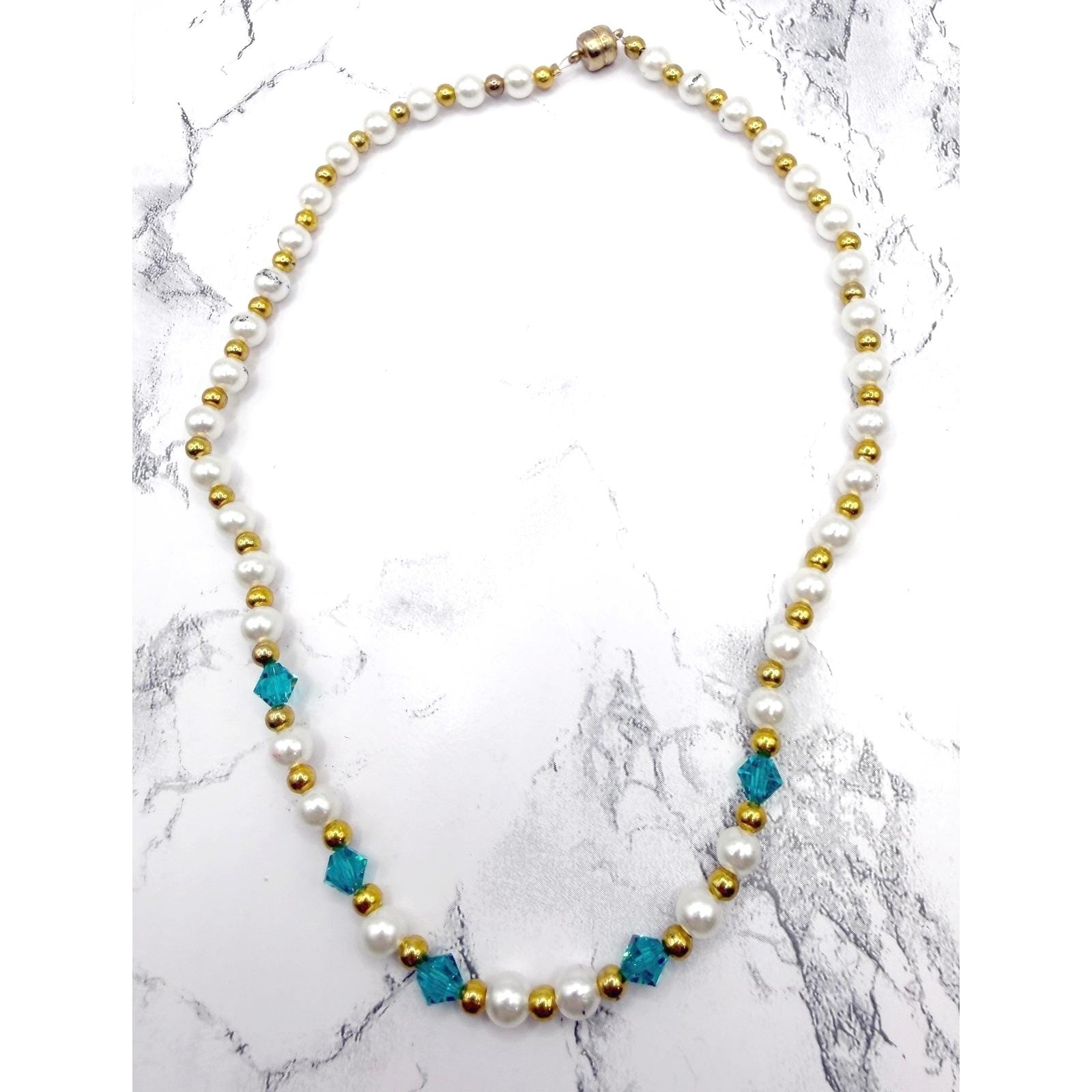 Girls Faux Pearl Teal Crystal Necklace Gold Tone Easter Sunday Church Jewelry