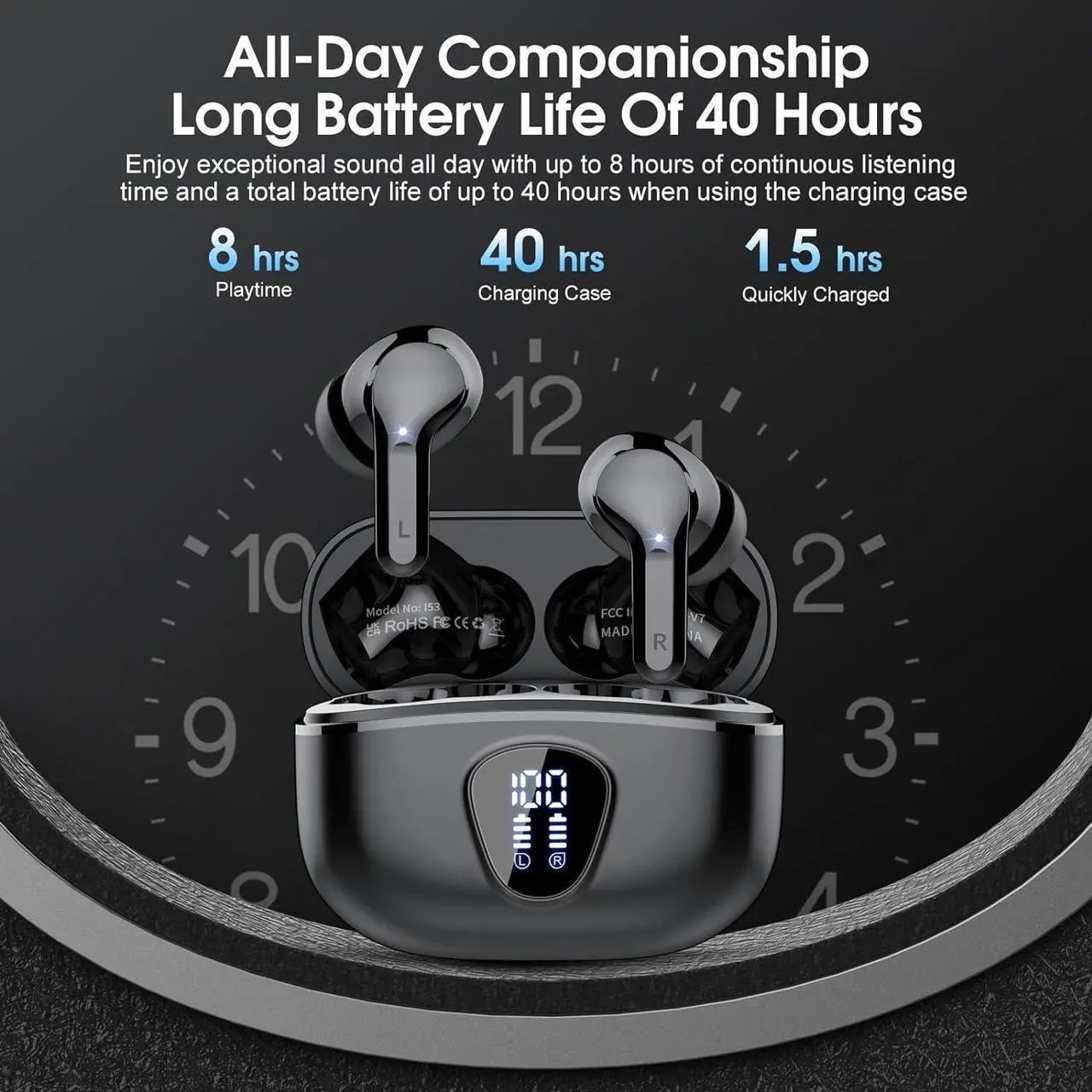 Wireless Earbuds Bluetooth 5.3 Headphones 40H Playback HiFi Stereo LED Display