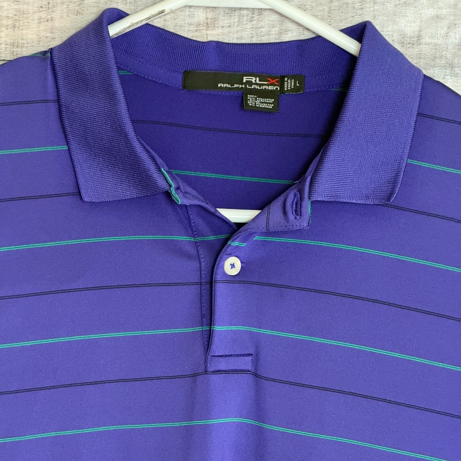 RLX Ralph Lauren Mens Polo Shirt Large Purple Striped Performance Preppy Classic