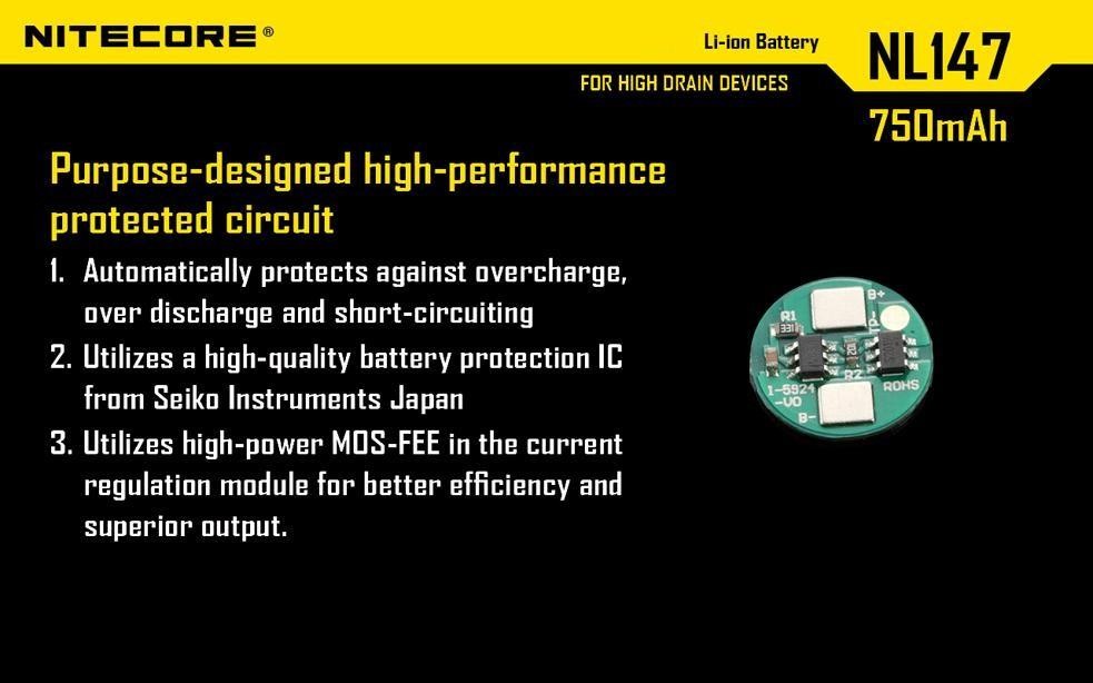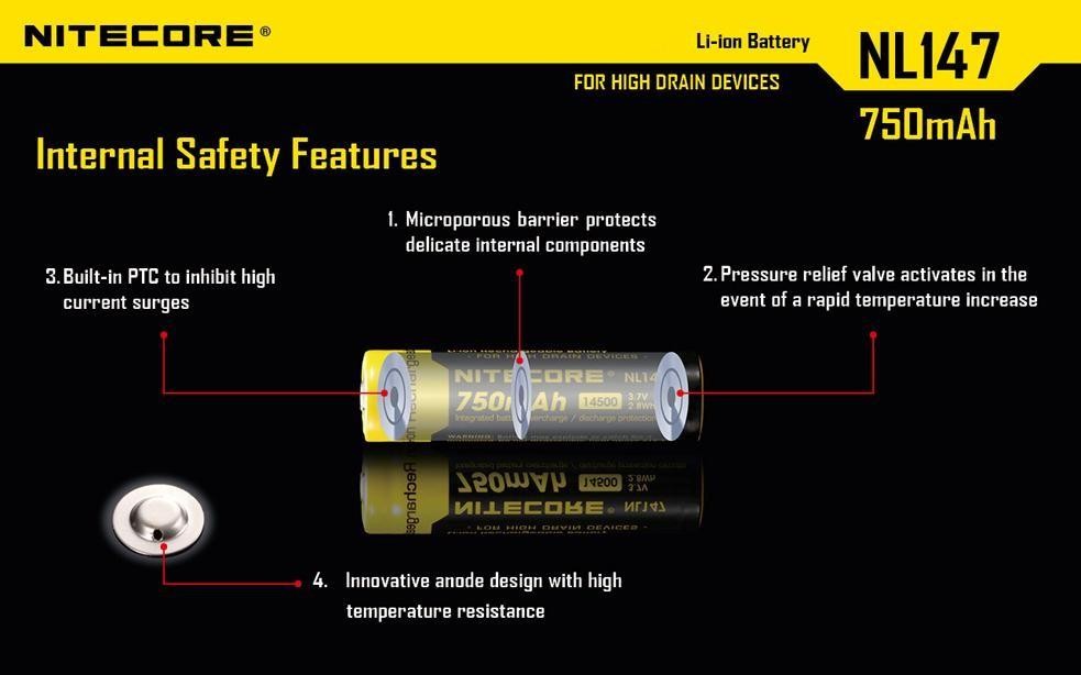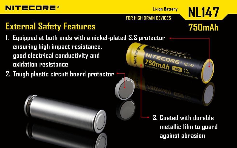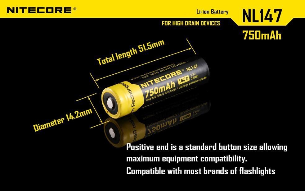 2 X Nitecore 750mAh Protected Rechargeable Batteries NL147 for flashlights