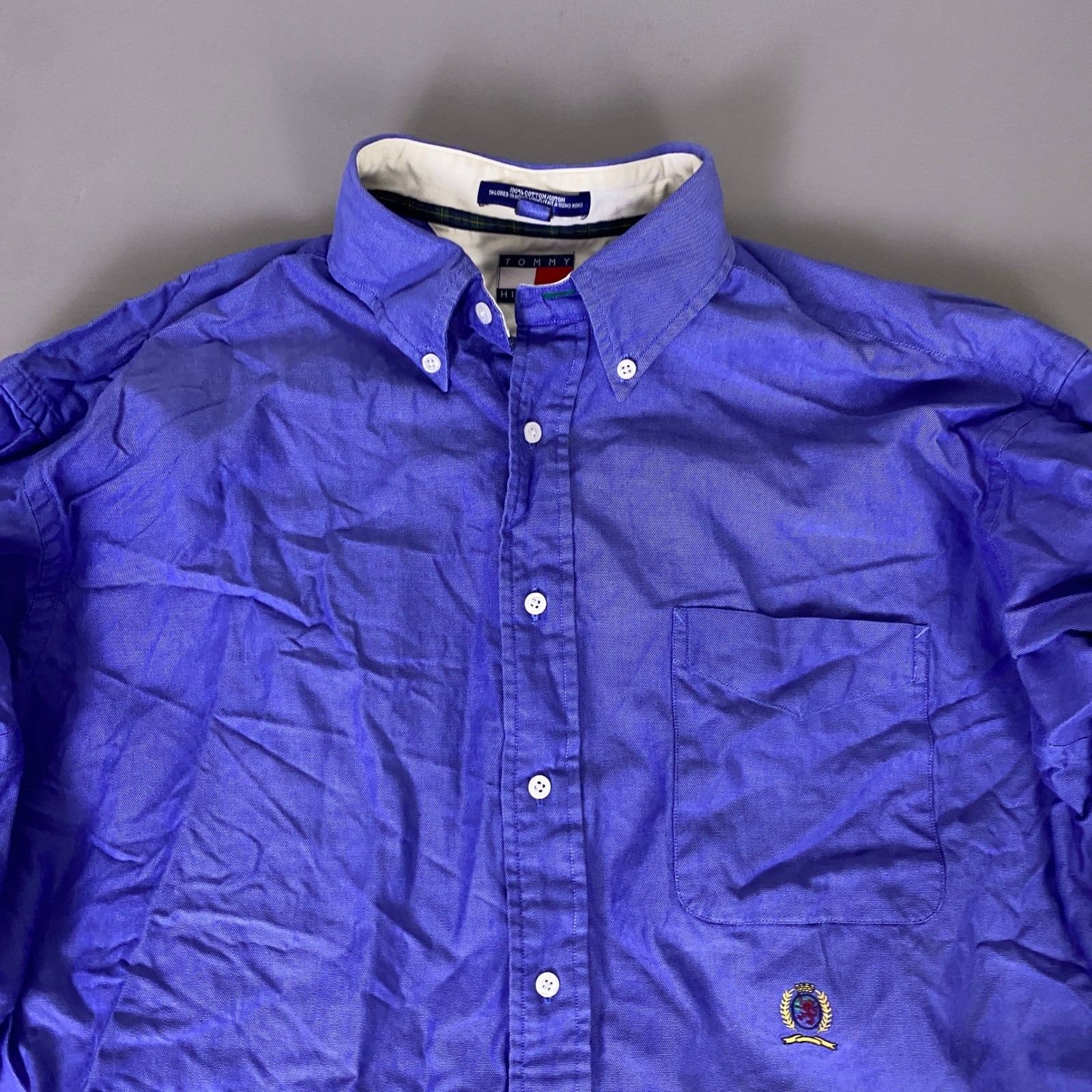 Vintage Tommy Hilfiger Button Down Shirt 16.5 32-33 Mens Blue Embroidered Flaws