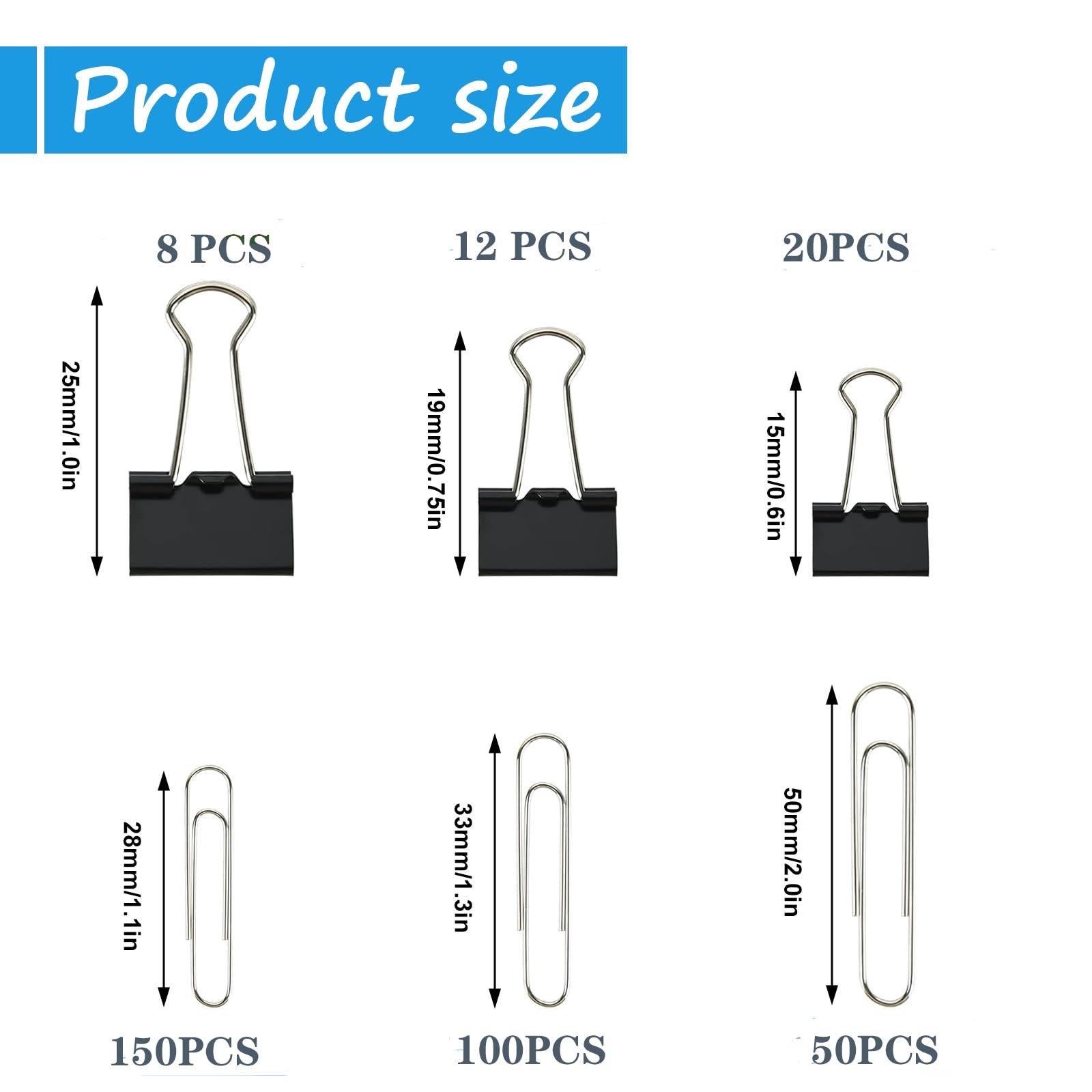 340 PCS Paper Clips Large, Medium, Small, Black Binders and Silver Paperclips
