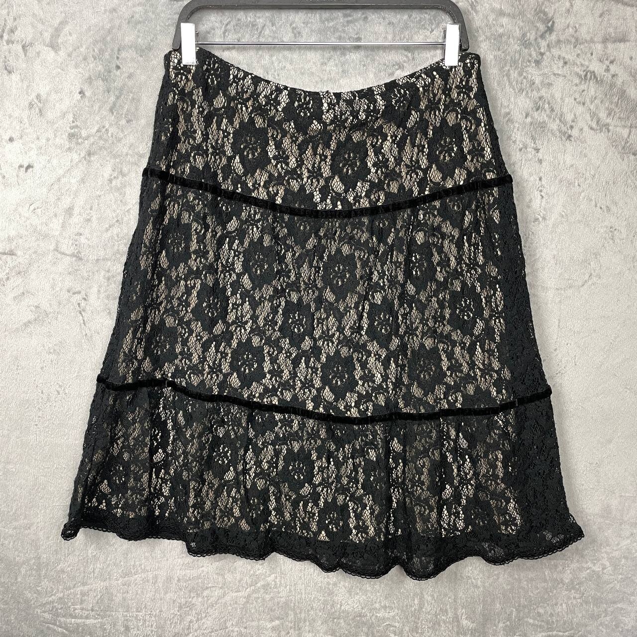 как выглядит Black Lace Tiered Midi Skirt Velvet Trim Whimsigoth Witchy Romantic Gothic Large фото