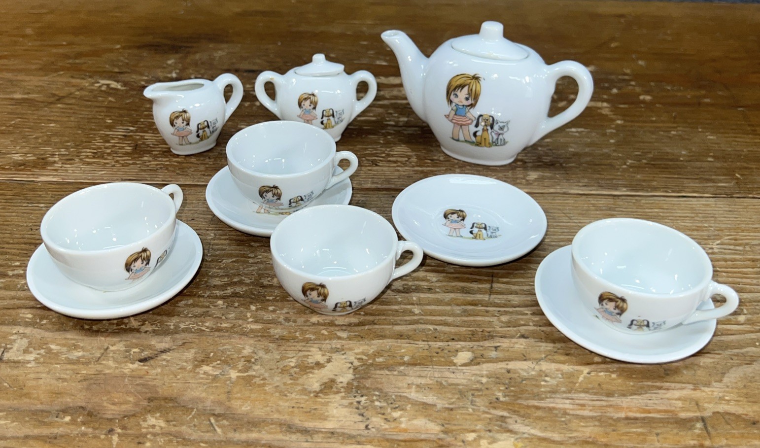 как выглядит Vtg 11 Piece Miniature Childs Porcelain Tea Set Japan Mid Century Girl Dog Cat фото