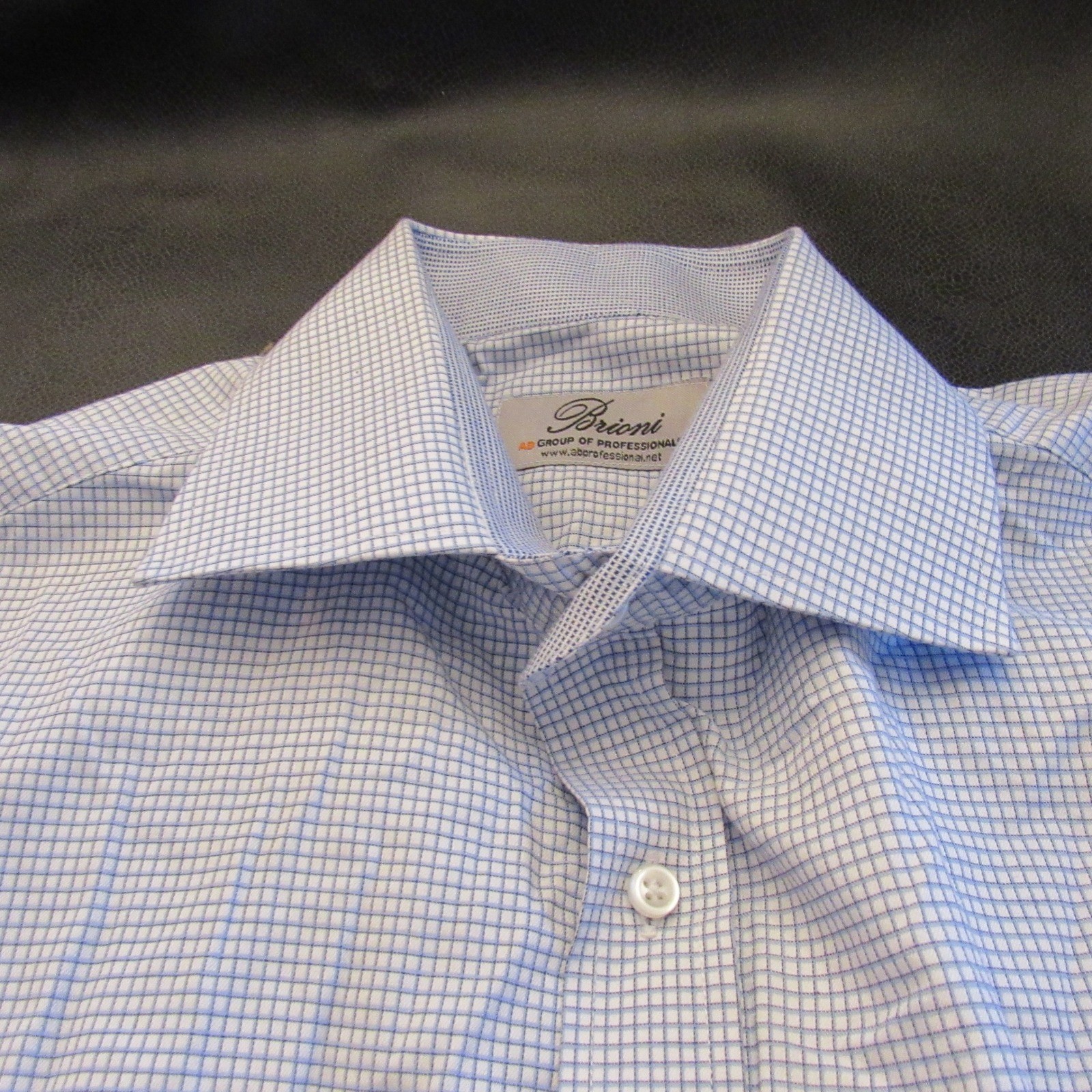 Brioni Mens Blue White Micro Check Spread Collar Dress Shirt Monogrammed 23.5