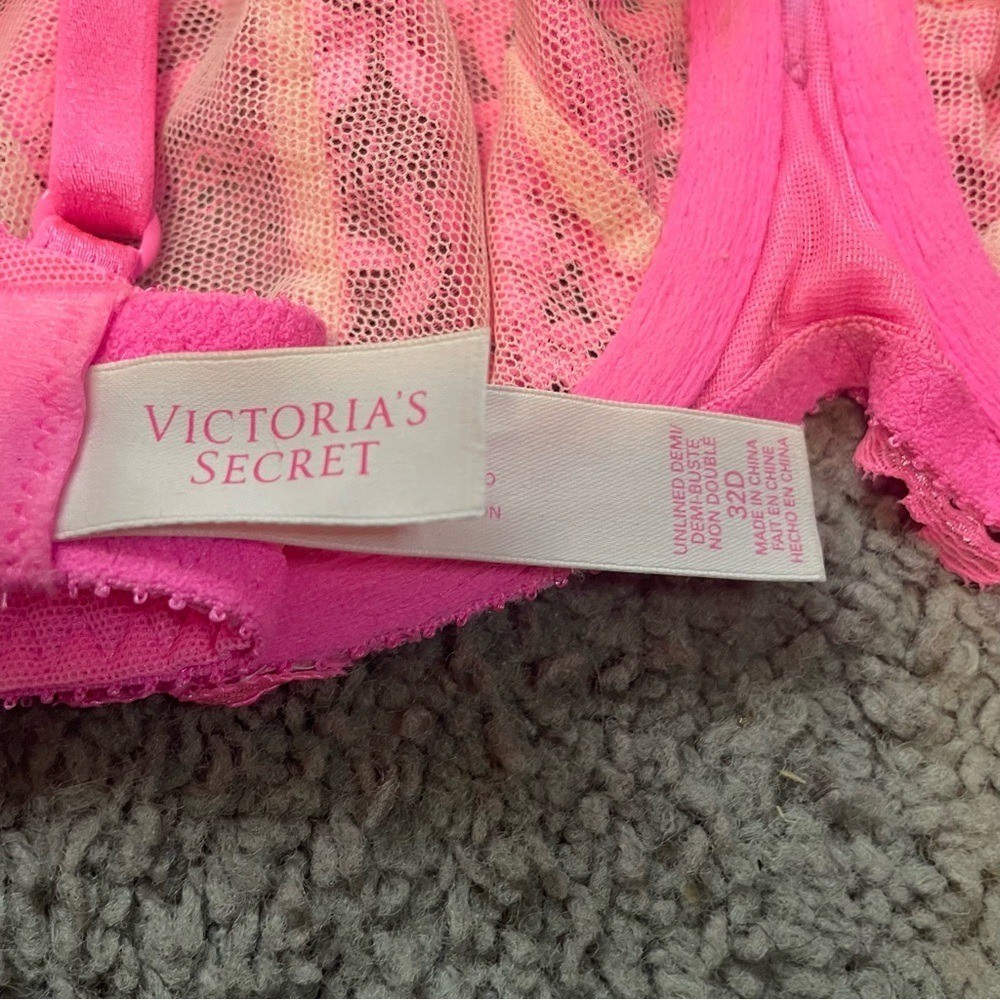как выглядит Victorias Secret Bubblegum Neon Pink Unlined Demi Bra Sz 32D Lace Bow Babydoll фото