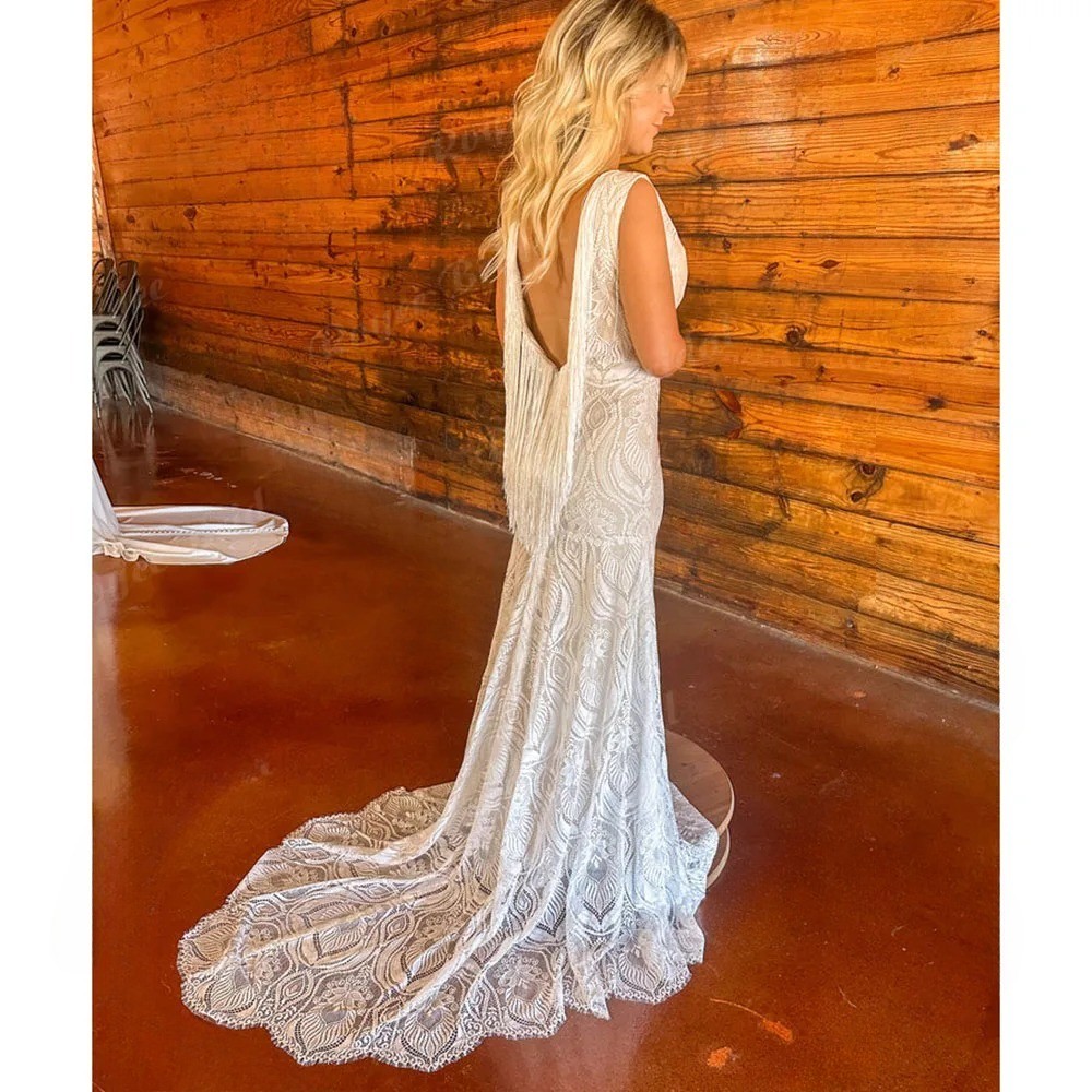 Boho Mermaid Wedding Dresses V-Neck Backless Lace Appliques Bridal Gowns