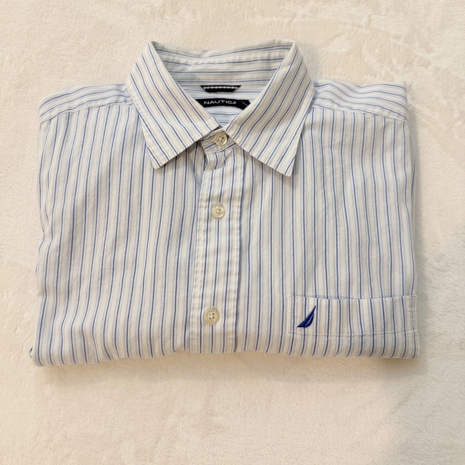 как выглядит Nautica Mens Classic Fit Striped Button Down Shirt Purple White Strip Size Large фото