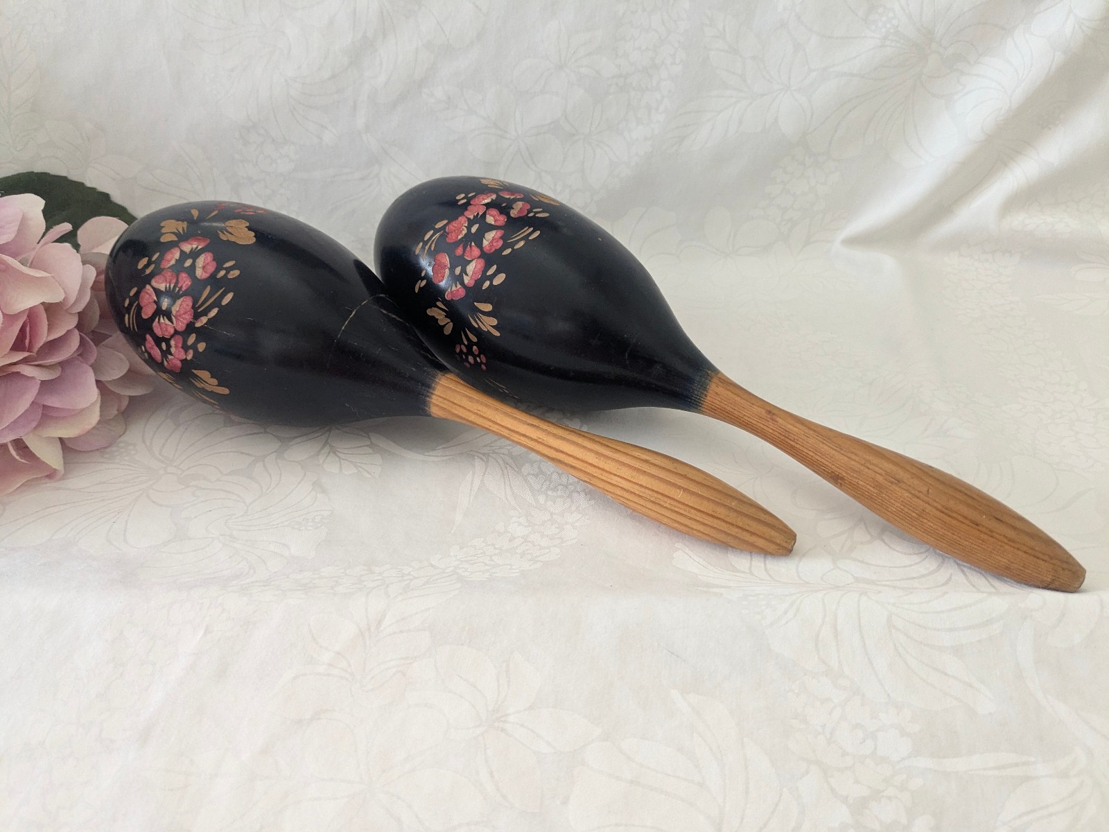 как выглядит Set of Vintage Maracas 12" Wood Carved Etch Floral Latin Percussion Mexico фото