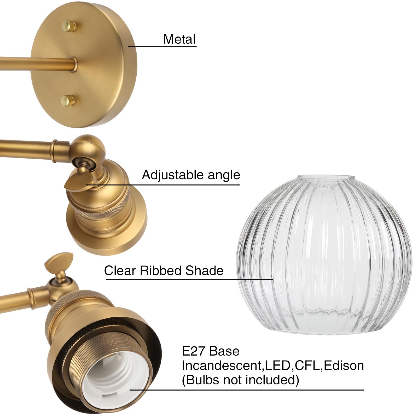 PERMO Antique Wall Sconces with Clear Ribbed Globe Glass Shade Vintage Gold S...