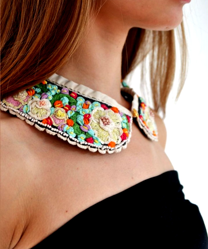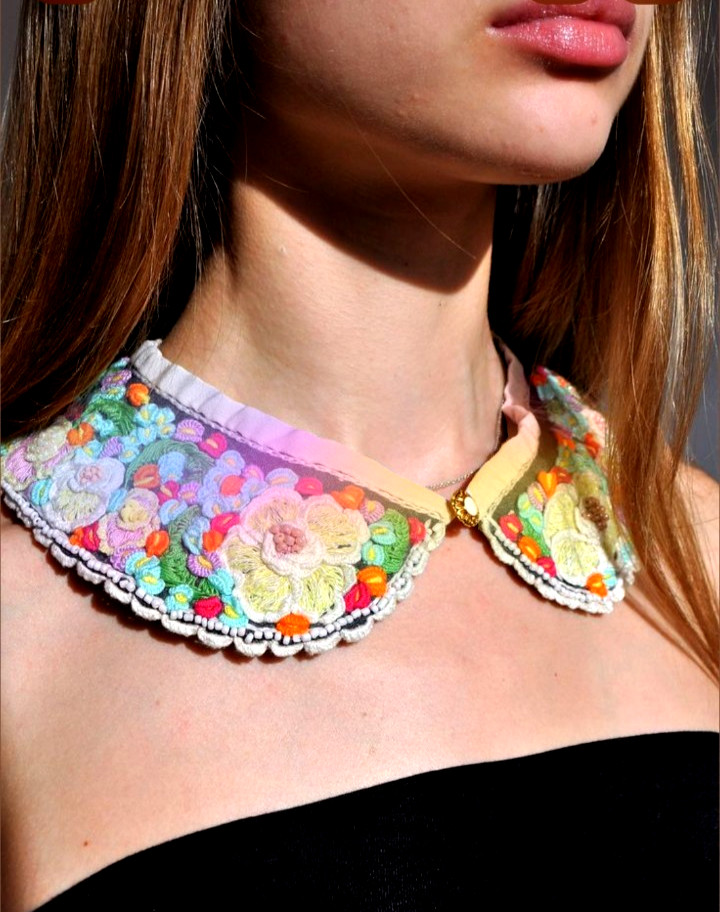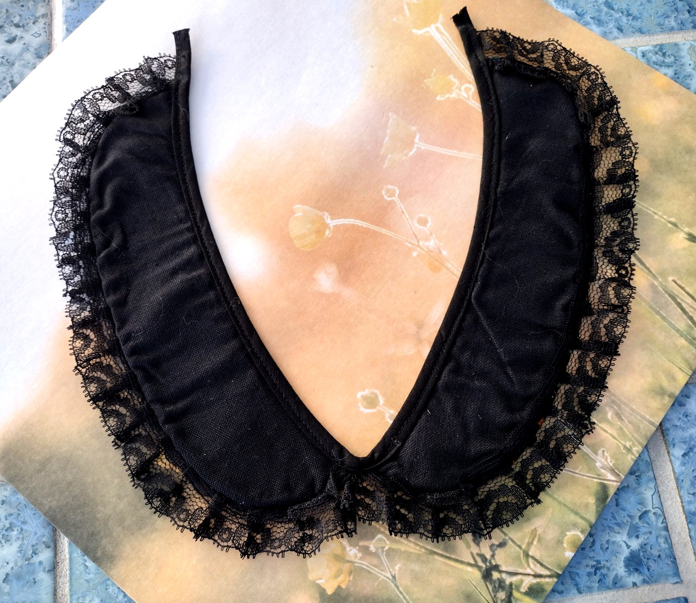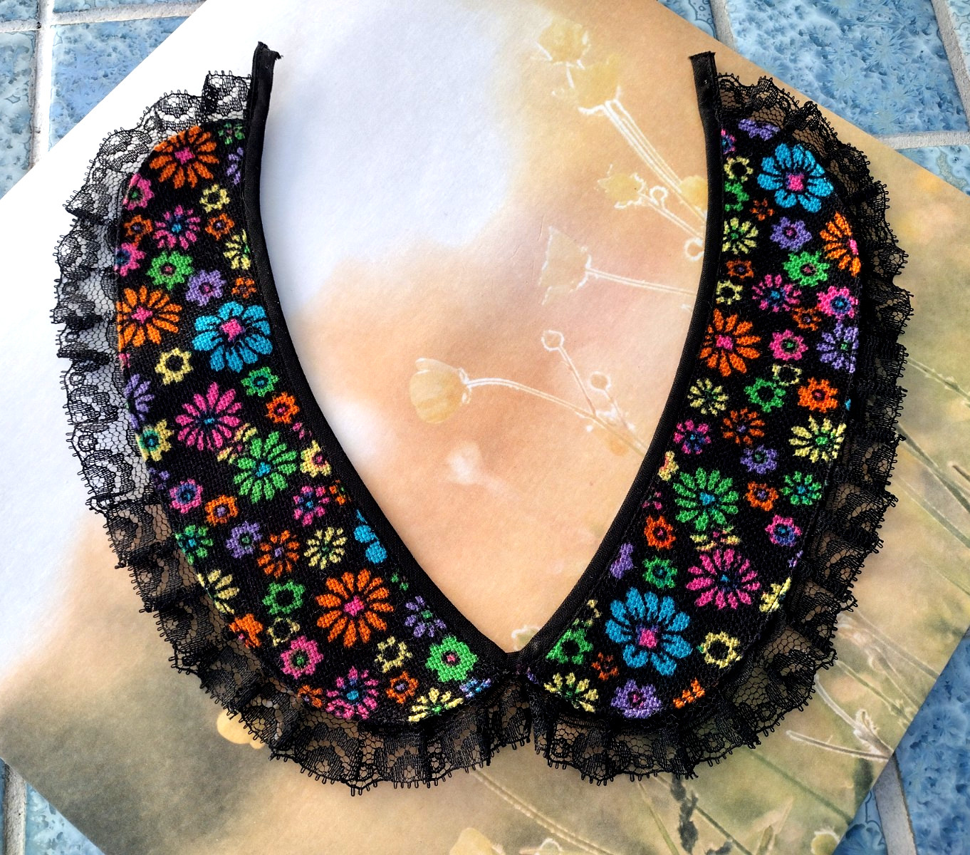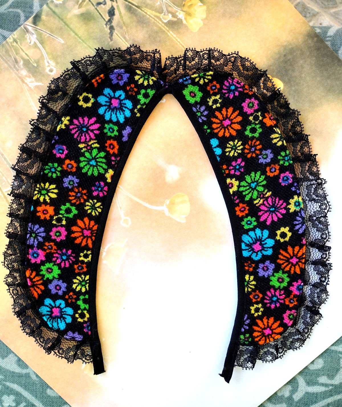 как выглядит Vtg Peter Pan Collar Loose Detachable Black Muli Floral Print Lace Ruffle Trim фото