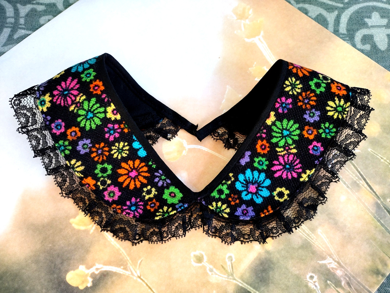 Vtg Peter Pan Collar Loose Detachable Black Muli Floral Print Lace Ruffle Trim