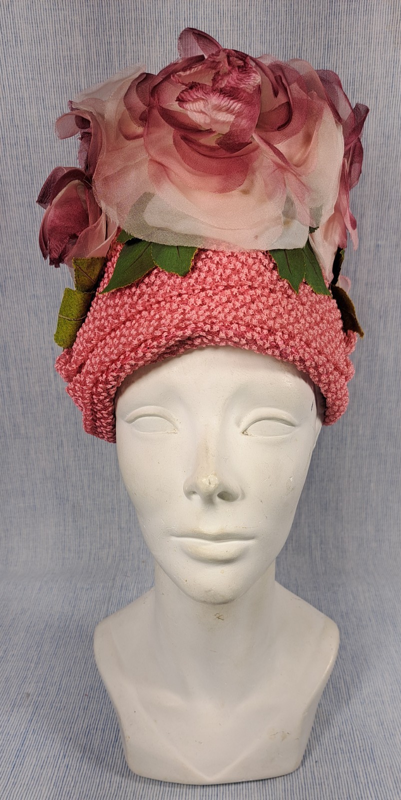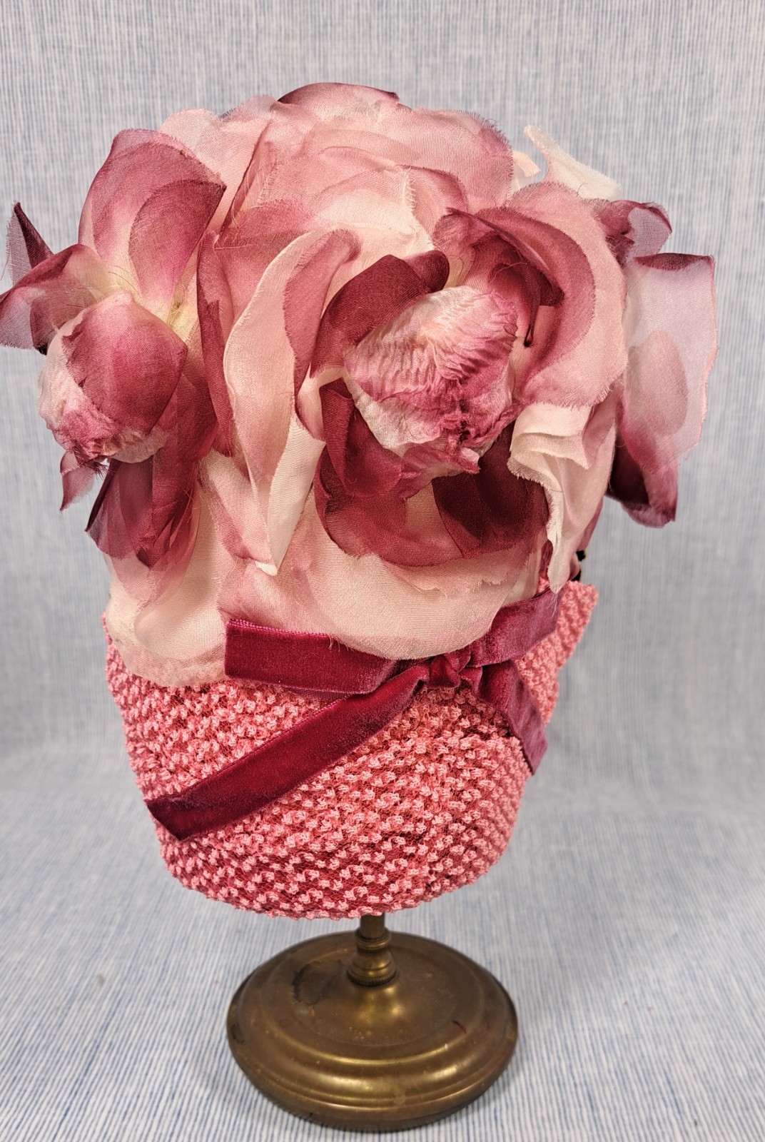 PRIVATE LISTING PINK HELMET CLOCHE STYLE HAT WITH FLORALS, VELVET BUSTLE HAT