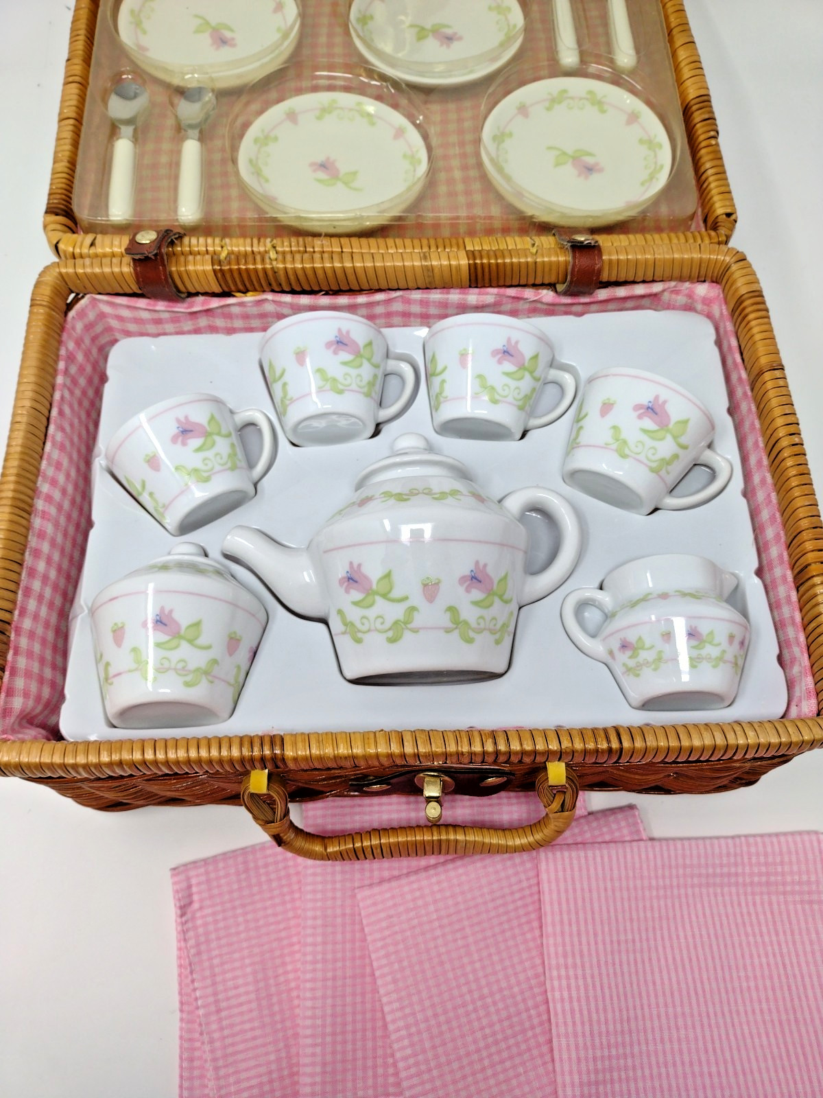 как выглядит Porcelain Childrens Pretend Play Tea Set with Plates, Cups, Teapot Basket фото