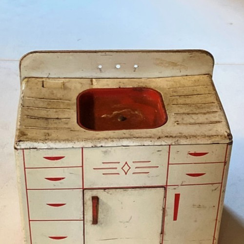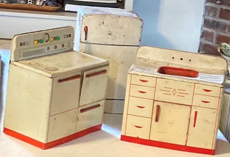 как выглядит Wolverine Supply Mfg Co Tin Toy Childs Kitchen Set: Sink Fridge Stove Vtg 50s фото