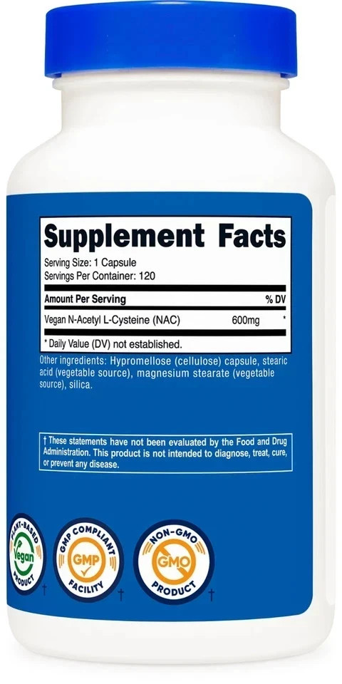 Ingredients: NAC (N-Acetyl L-Cysteine), Hypromellose (Cellulose) Capsule, Rice Flour, Magnesium Stearate (Vegetable Source), Stearic Acid, N-Acetyl L-Cysteine