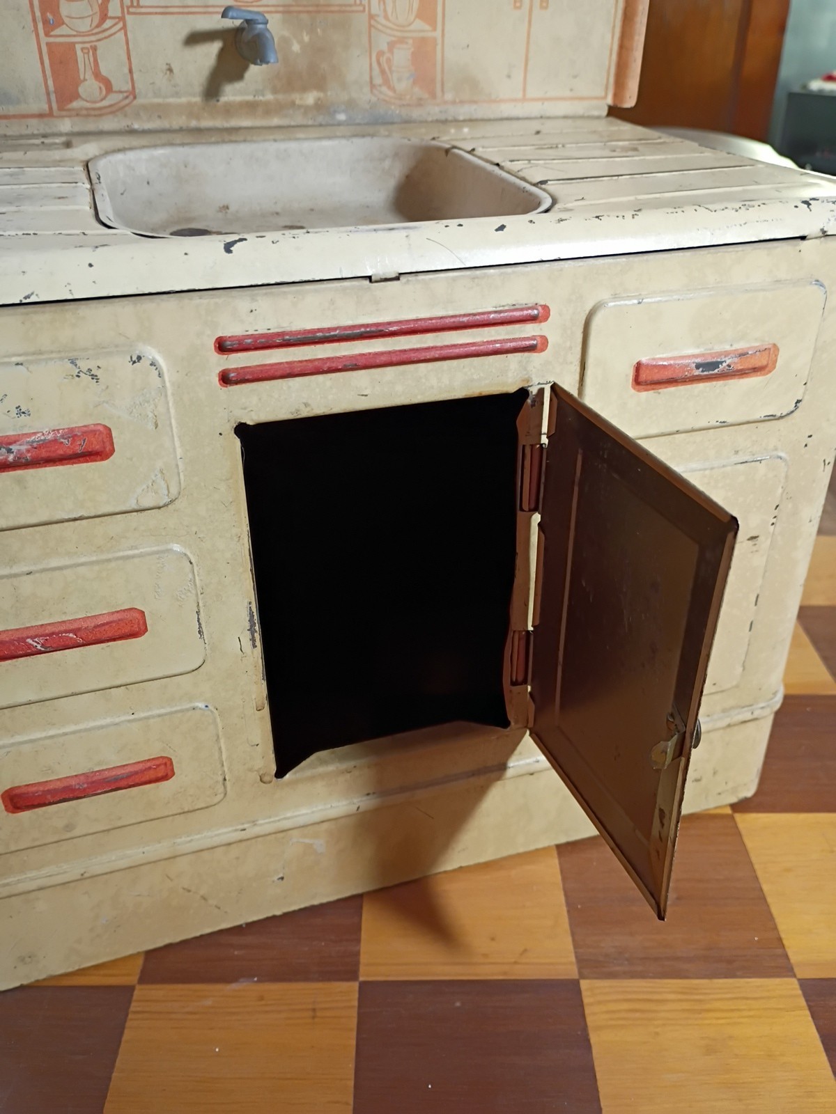 как выглядит Vintage WOLVERINE Kid Kitchen Metal Toy Sink Cabinet - Tin 1940s - 10.5"X11.5" фото