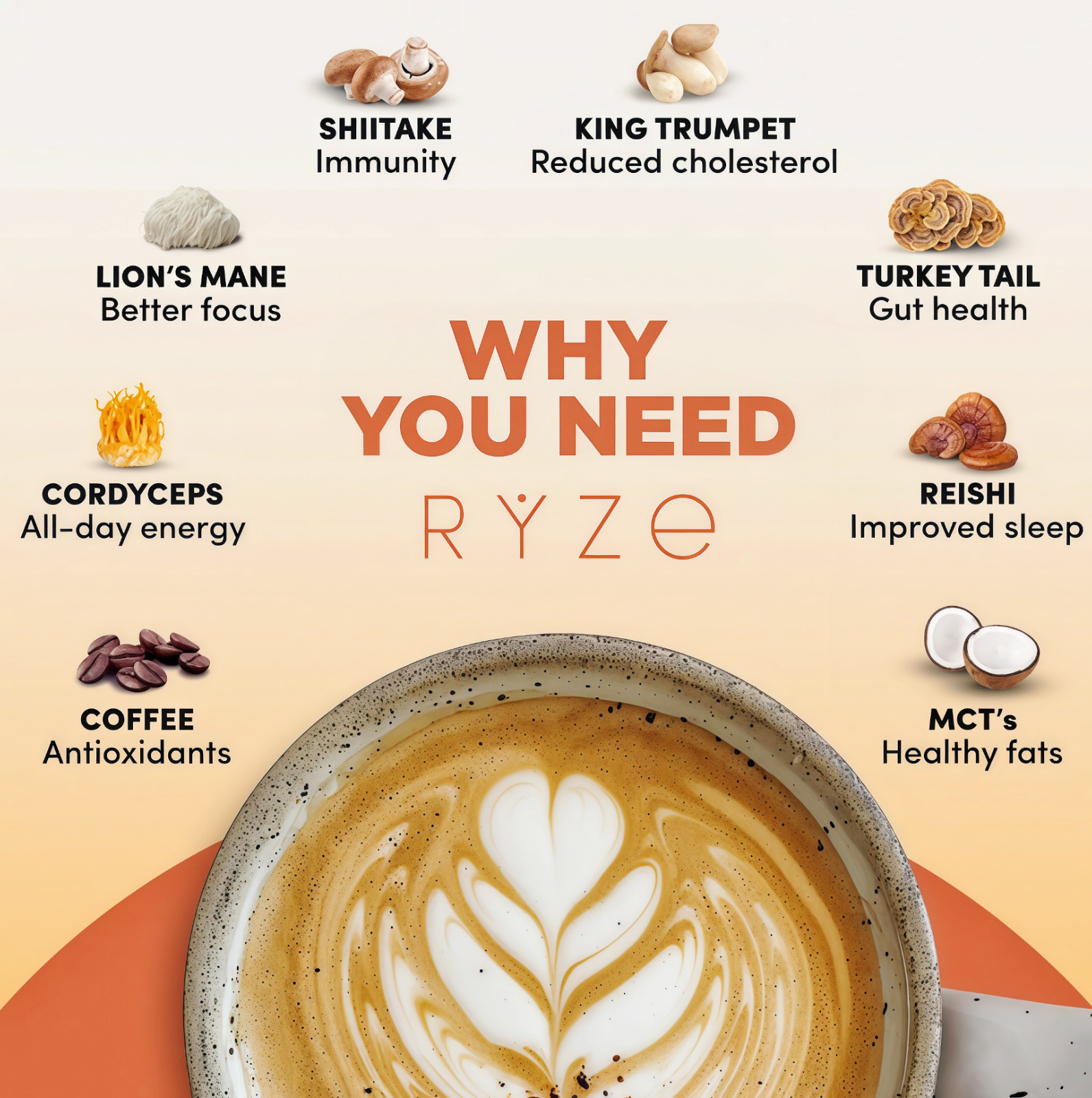 4-PCS RYZE Organic Mushroom Coffee 6 Mushrooms,MCT Oil,USA Grown Instant Coffee