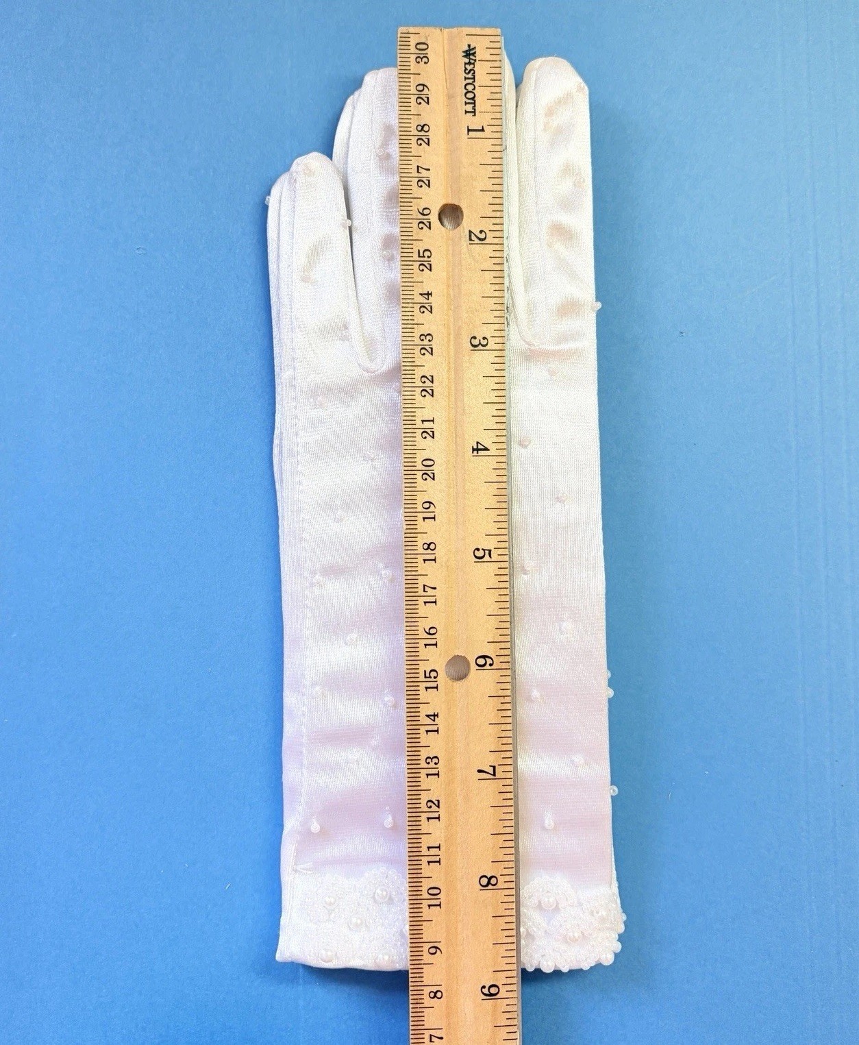 как выглядит Vtg Womens White Satin Faux Pearl Beaded Gloves Old Hollywood Bridal Wedding NOS фото