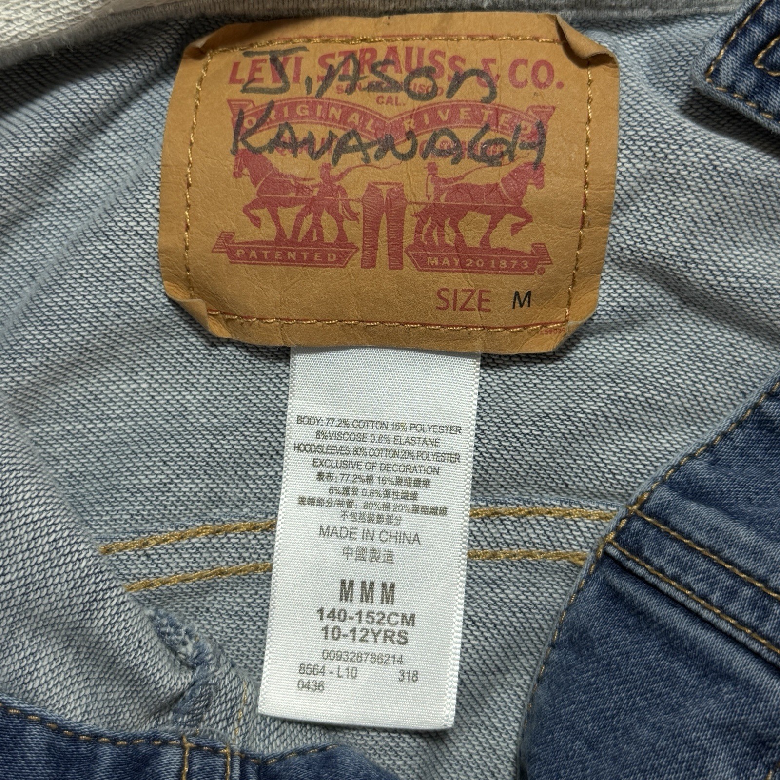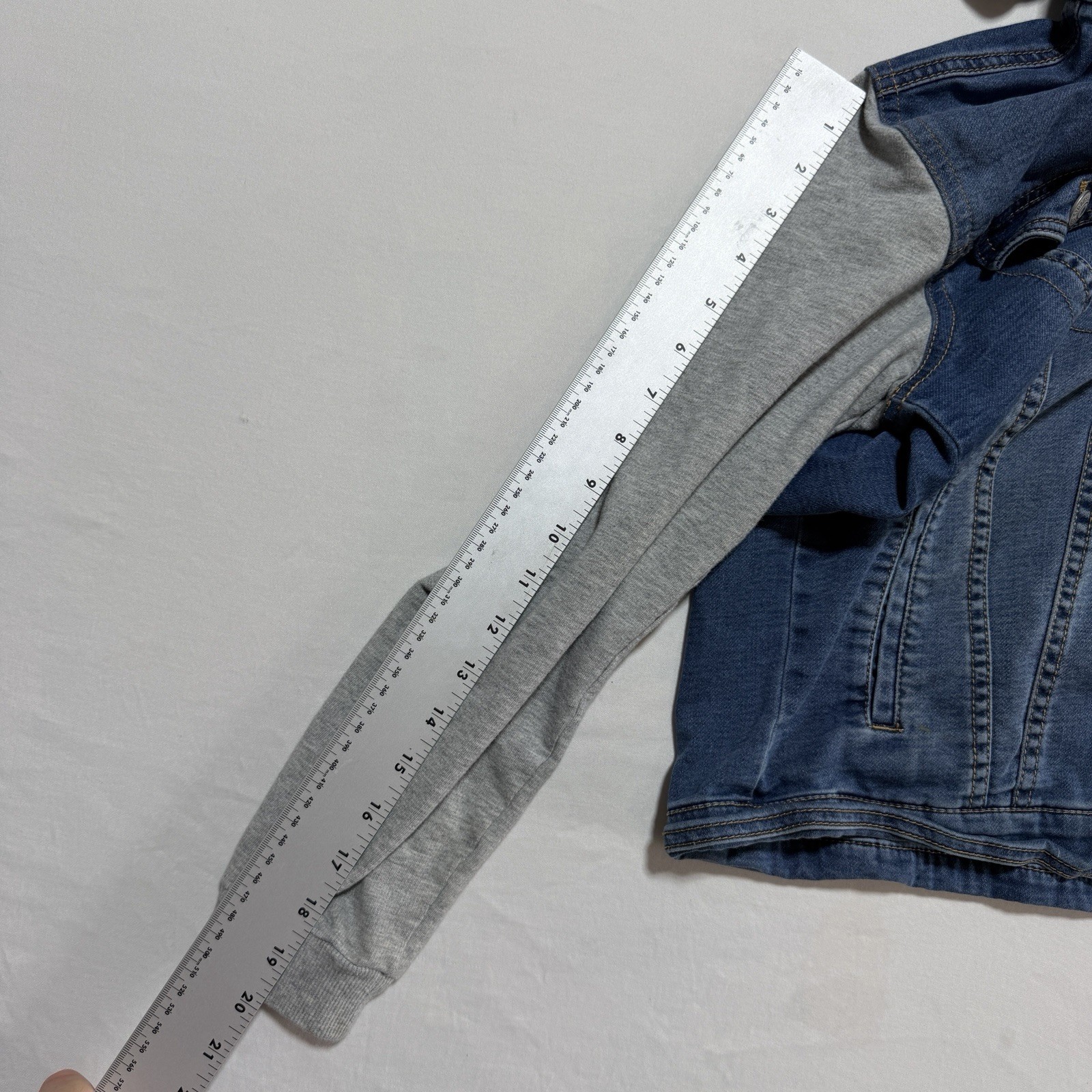 как выглядит Levis Kids Hooded Denim Trucker Jacket Size M 10-12 Gray Fleece Sleeves фото