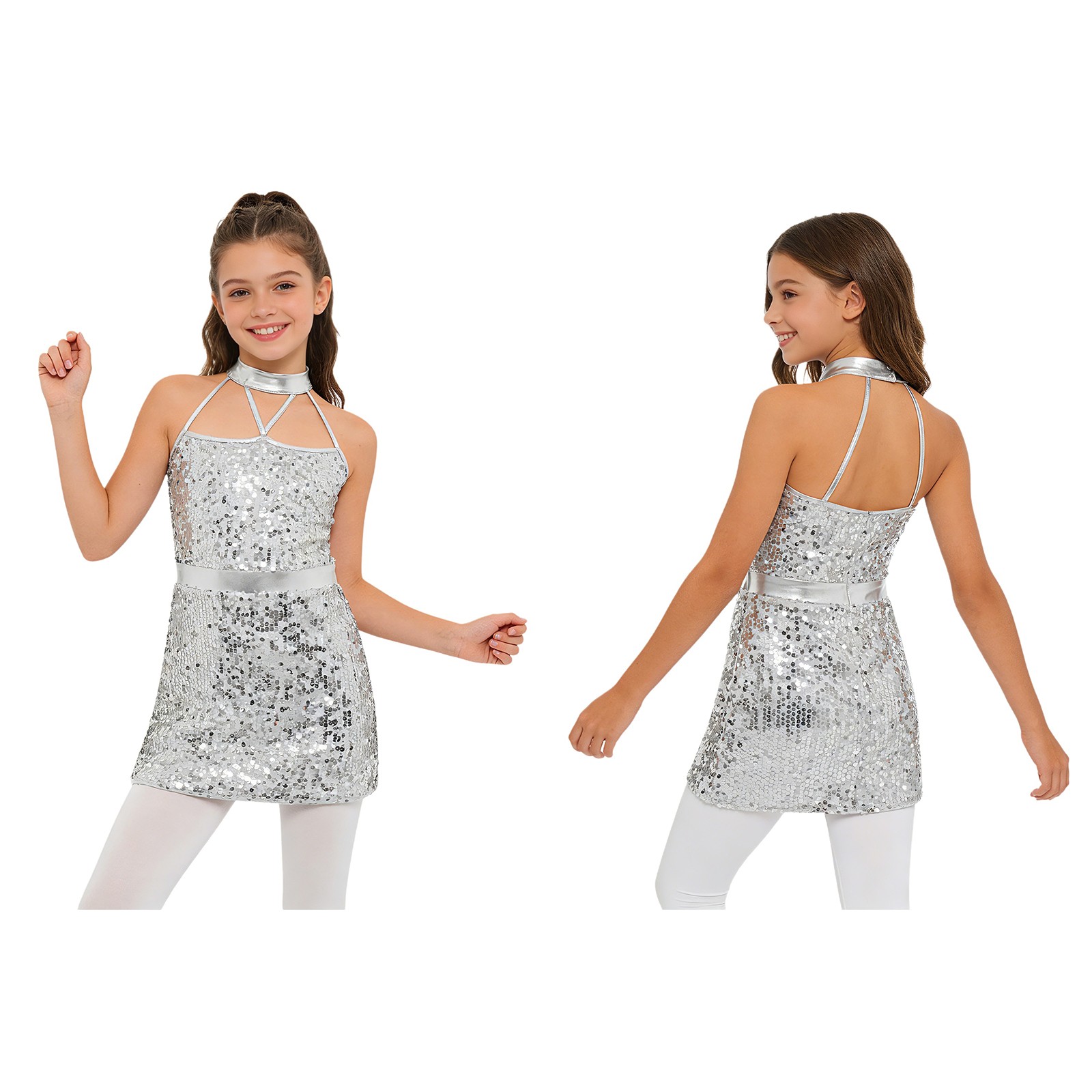 Girls Sequin Dress Glittery Hip Hop Performance Jazz Dance Metallic Trim Stage