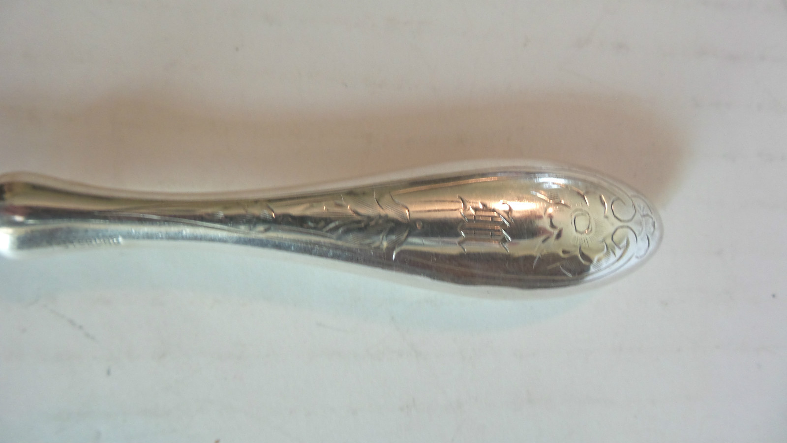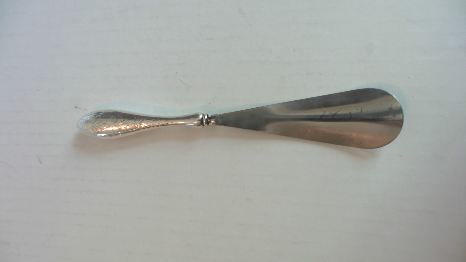 • LOVELY ANTIQUE AMERICAN STERLING HANDLED SHOE HORN with ENGRAVED FLORAL DESIGN