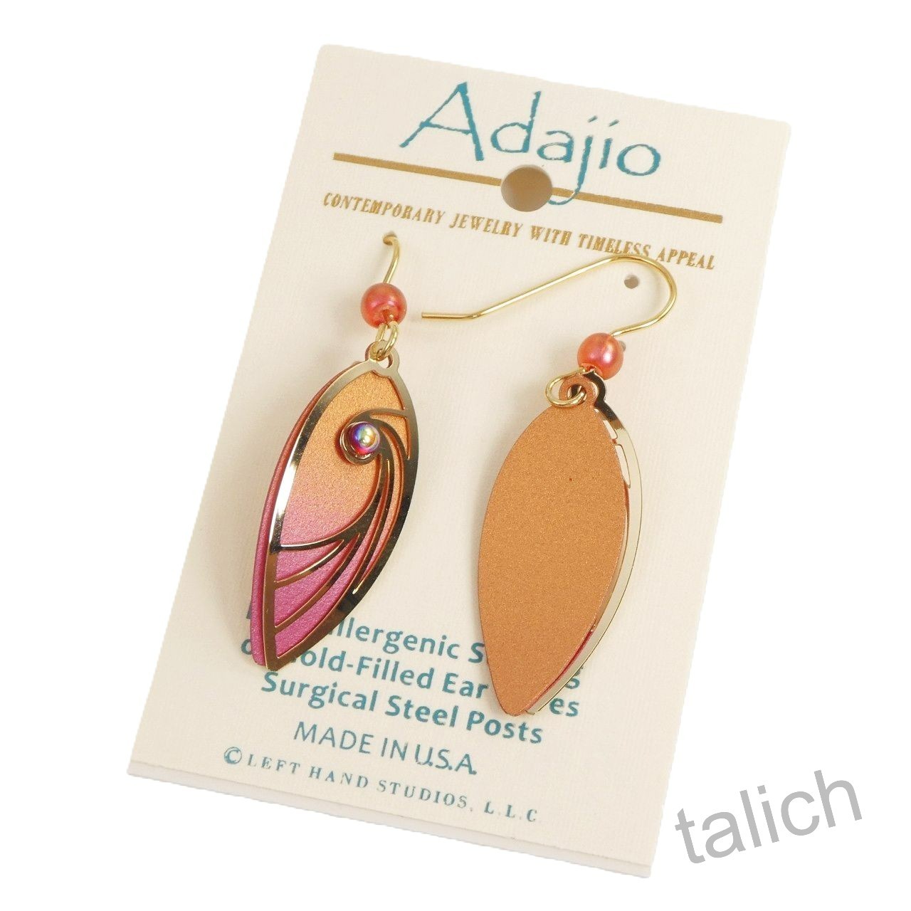 как выглядит Adajio Earrings Brown and Pink Teardrop with Shiny Gold Tone Swirl Overlay 7782 фото