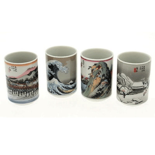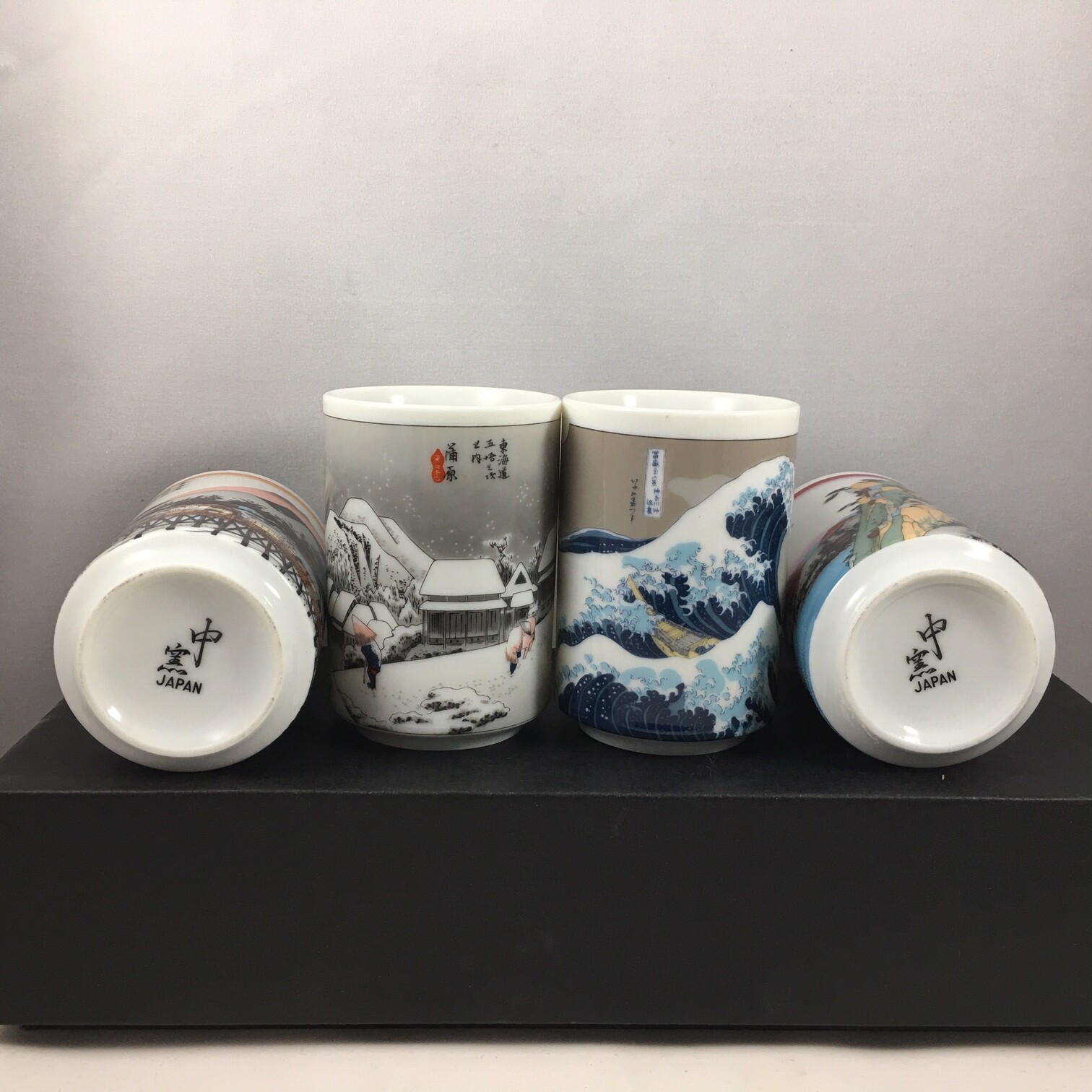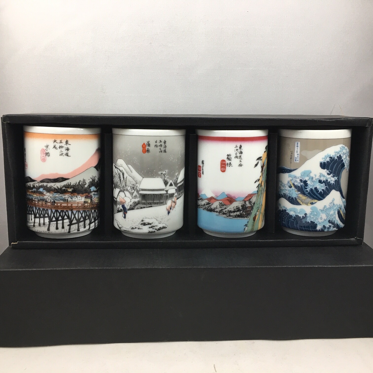 SET of 4 Japanese Porcelain Sushi Tea Cup Yunomi Hiroshige Tokaido Made in Japan
