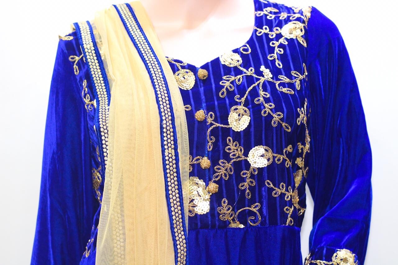 Indian Pakistani Blue Velvet Anarkali Style Kurta Set With Gold Jamawar Pants