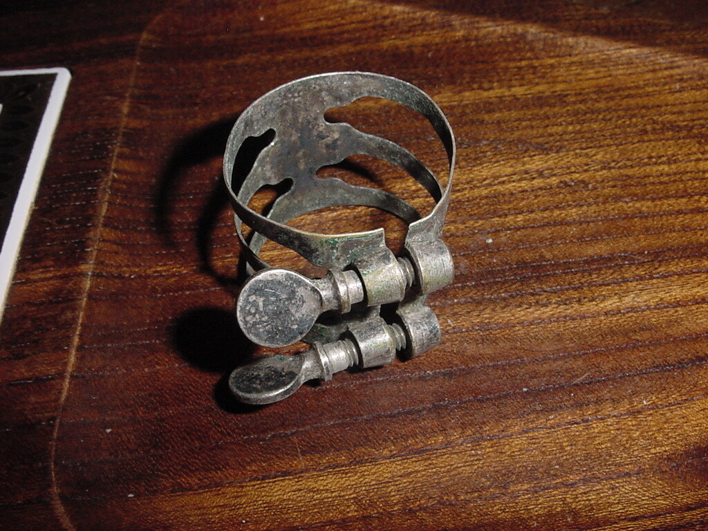 как выглядит VINTAGE NICKLE SILVER FINISH TRIPLE BAND TENOR SAX LIGATURE фото