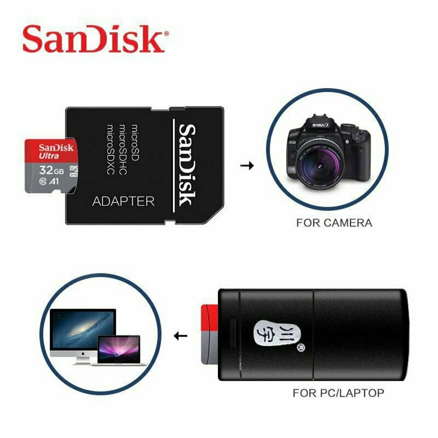 как выглядит Tarjeta SD SanDisk Adaptador USB y Memoria Unidad Flash de 32GB Class10 TF Micro фото