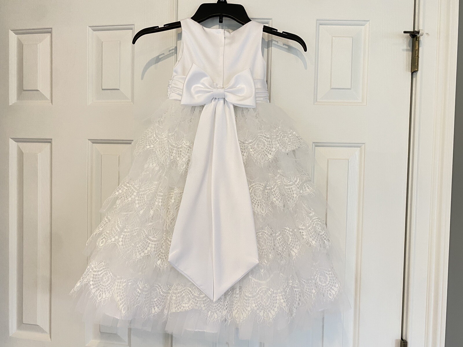 как выглядит Sweet Beginnings Flower Girl / Communion Dress 3T White Tiered Tulle Back Bow фото