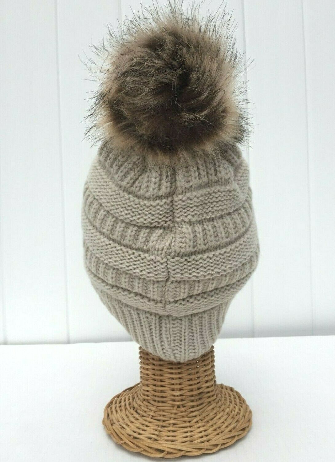 как выглядит Beige Cable Knit Winter Warm Beanie hat with Faux fur Pom Pom Soft Stretchy L фото