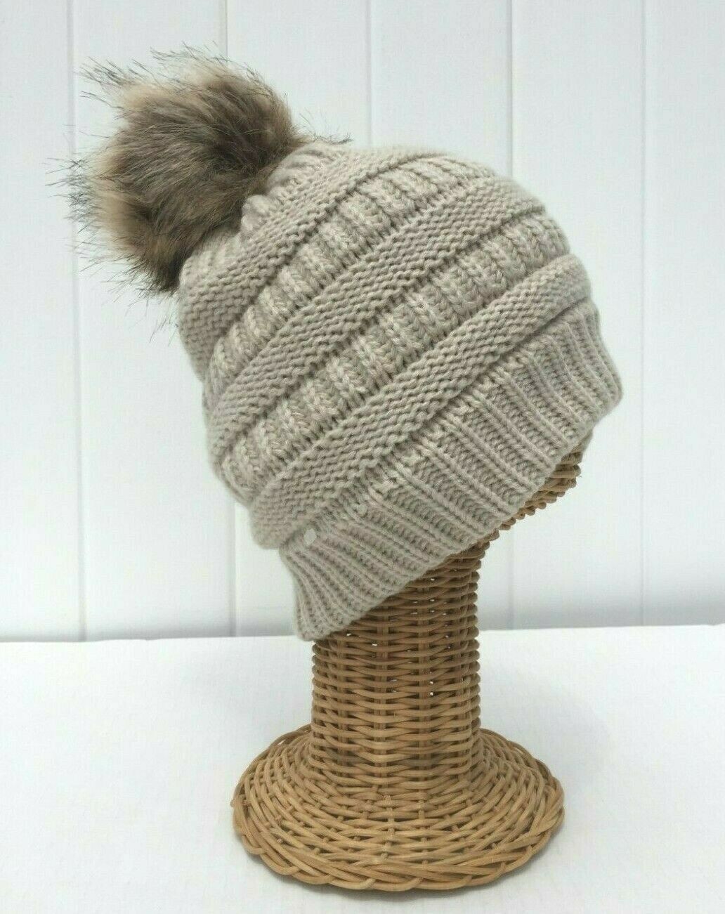 Beige Cable Knit Winter Warm Beanie hat with Faux fur Pom Pom Soft Stretchy L