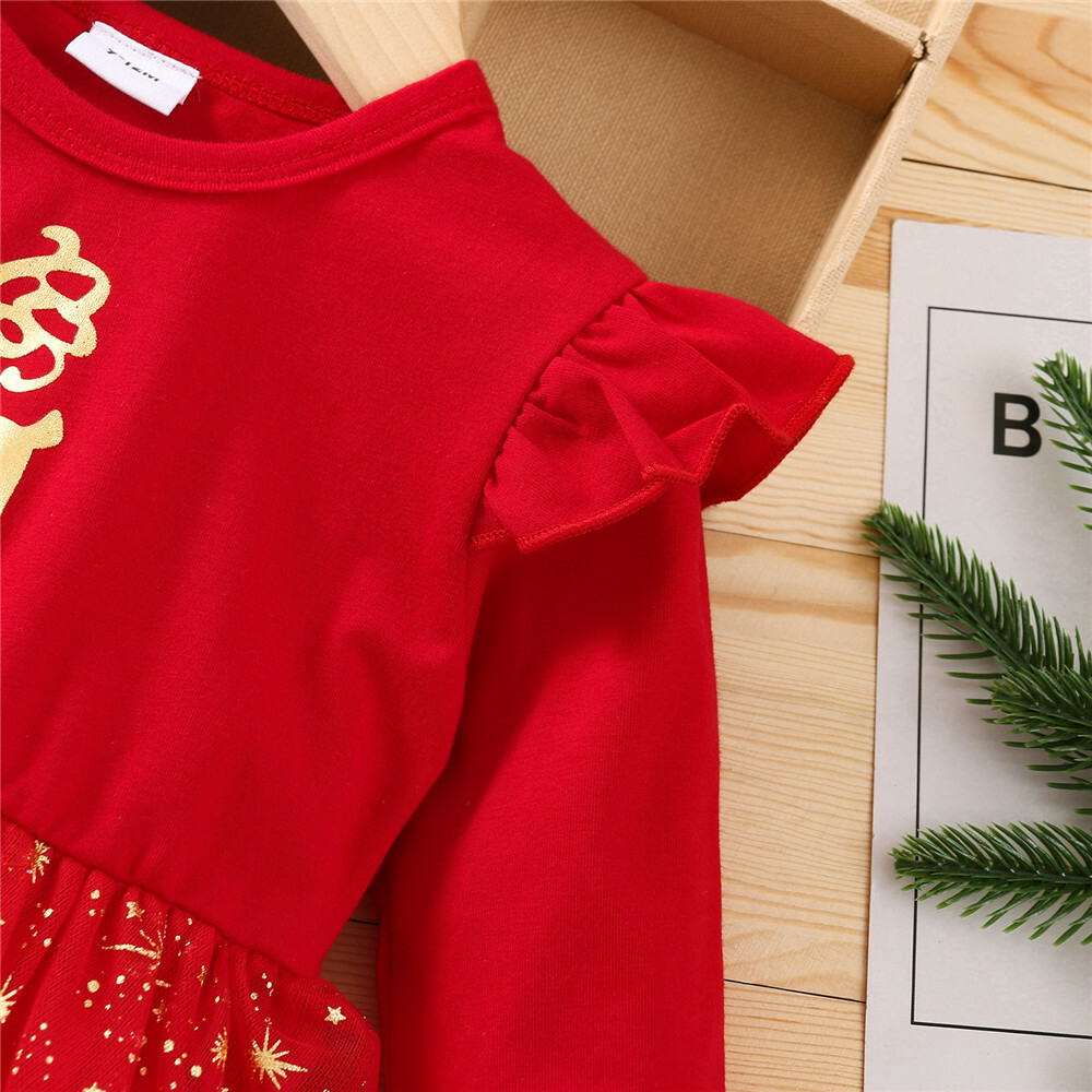 NEW Christmas Reindeer Girls Red Gold Stars Long Sleeve Tutu Dress