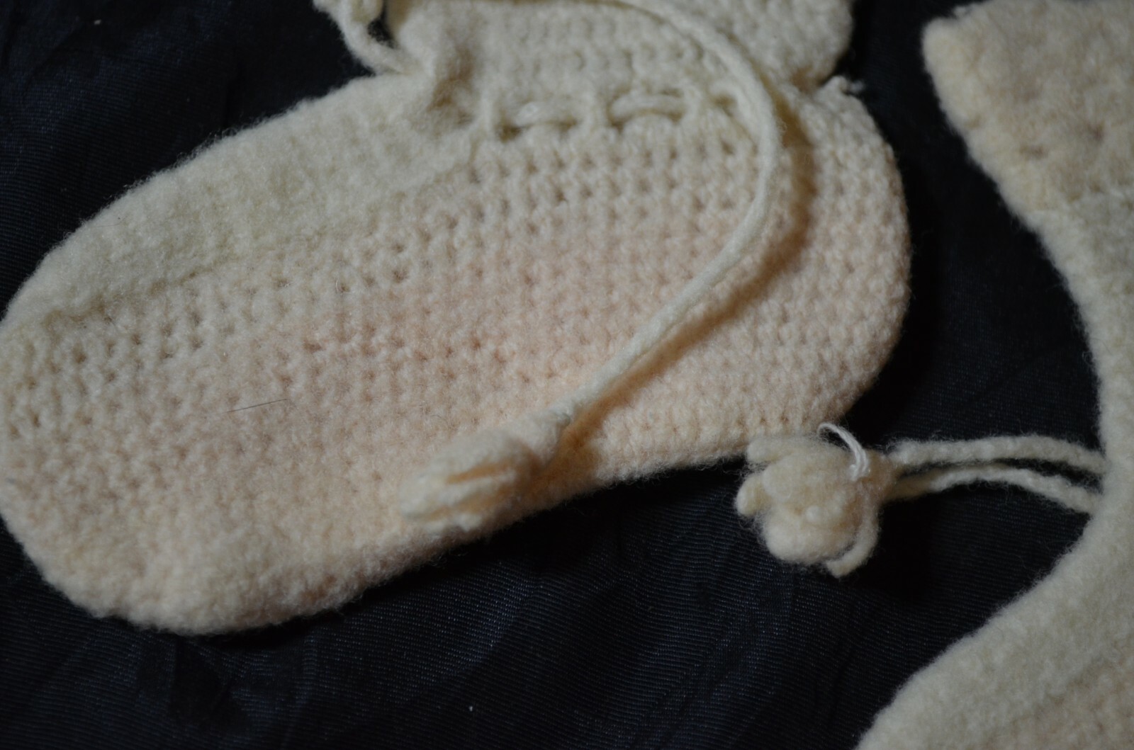 как выглядит Vintage Hand Knitted Baby Booties Socks Pale Pink w/ Pompom Ties, Crochet Short фото