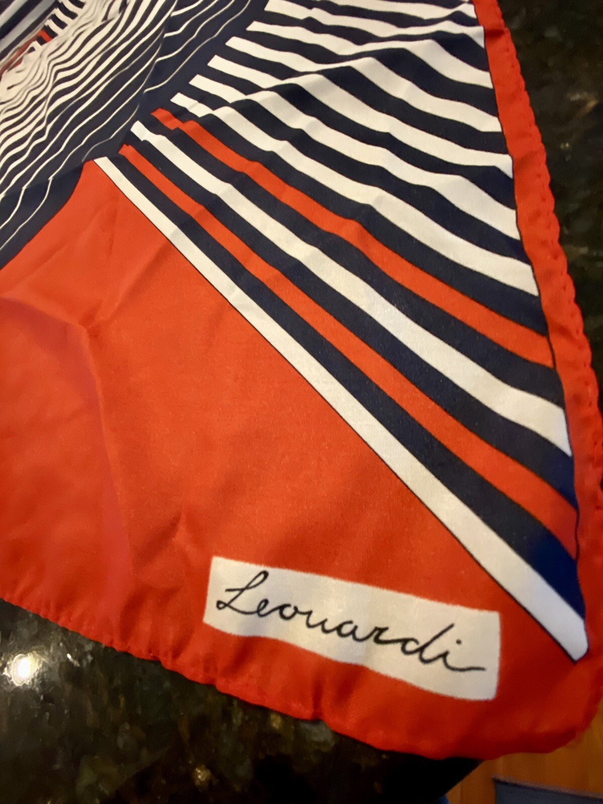 как выглядит Vintage Leonardi Scarf Red Gray Striped Geometric 30"x30" Red White Blue фото