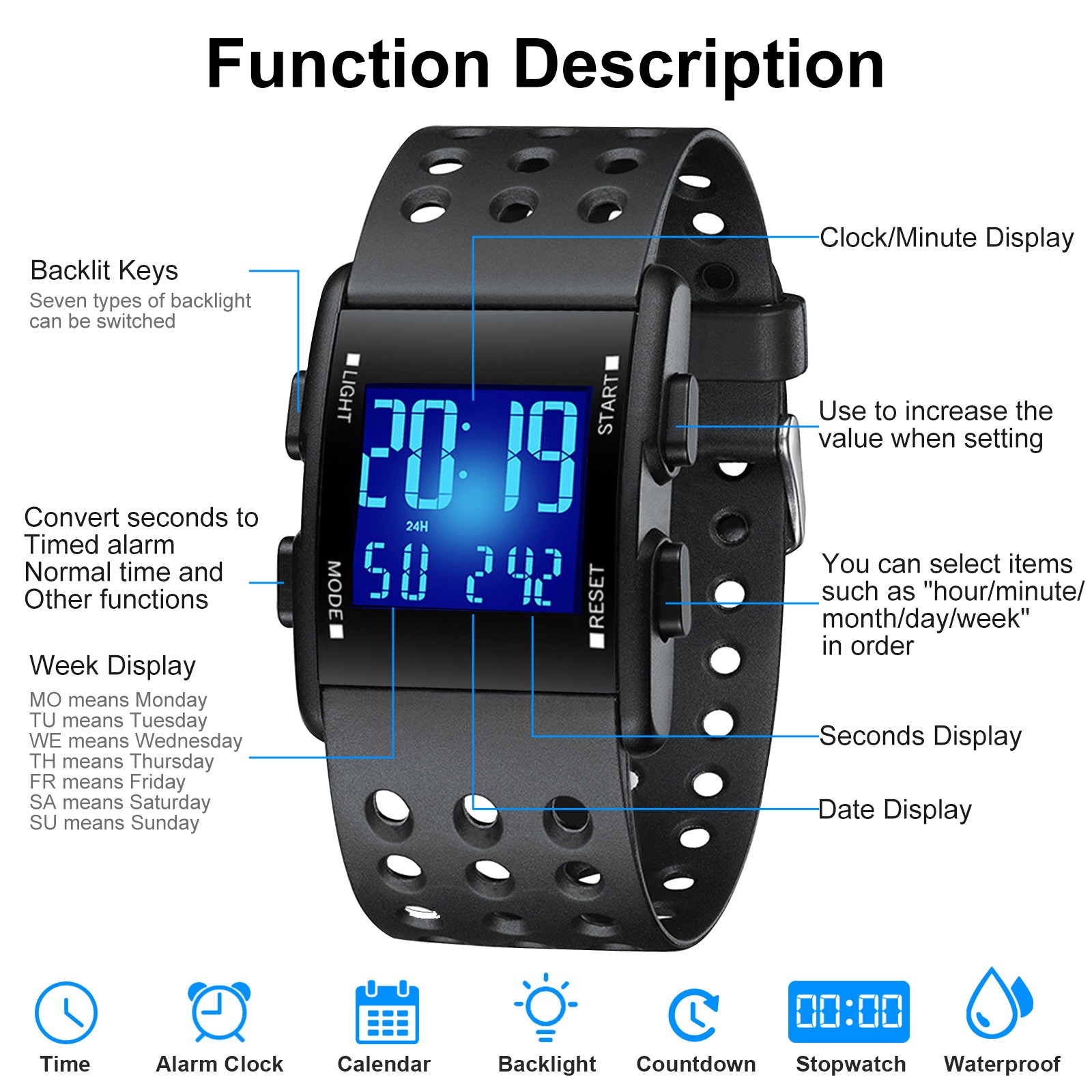 Function: Calendar Month / Day / Date, Week, Alarm, Back Light, Stop Watch