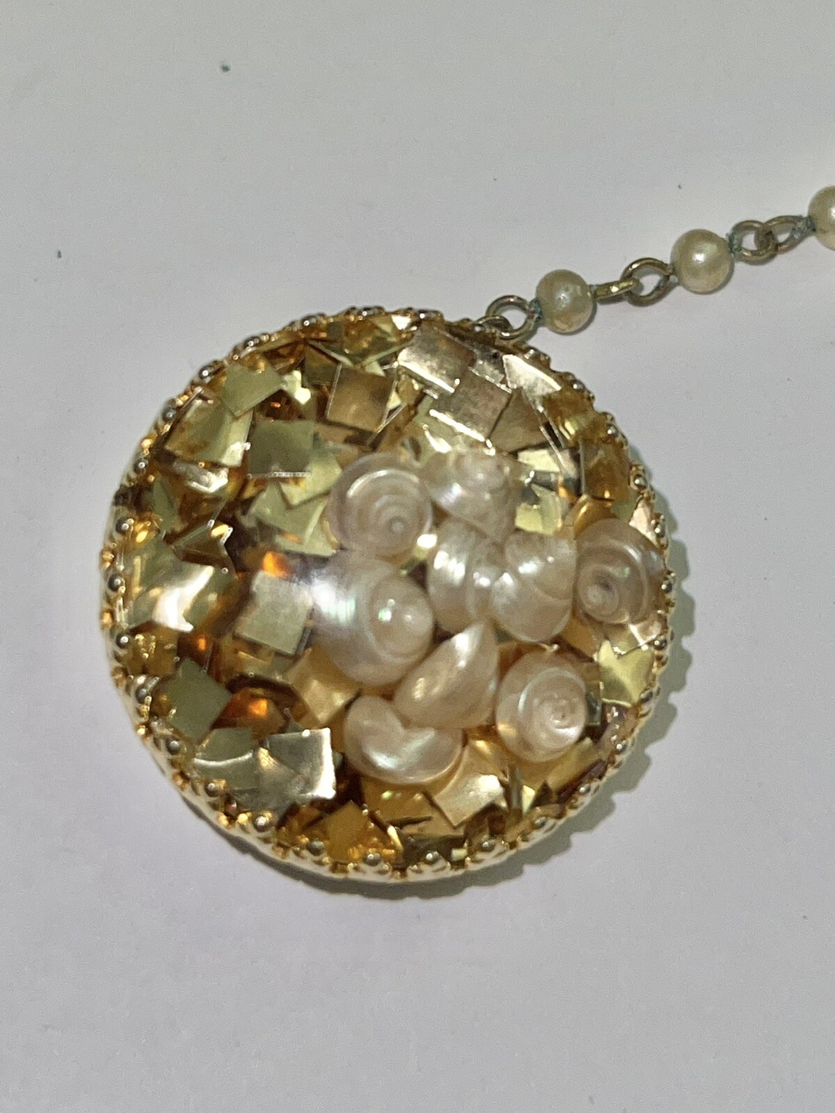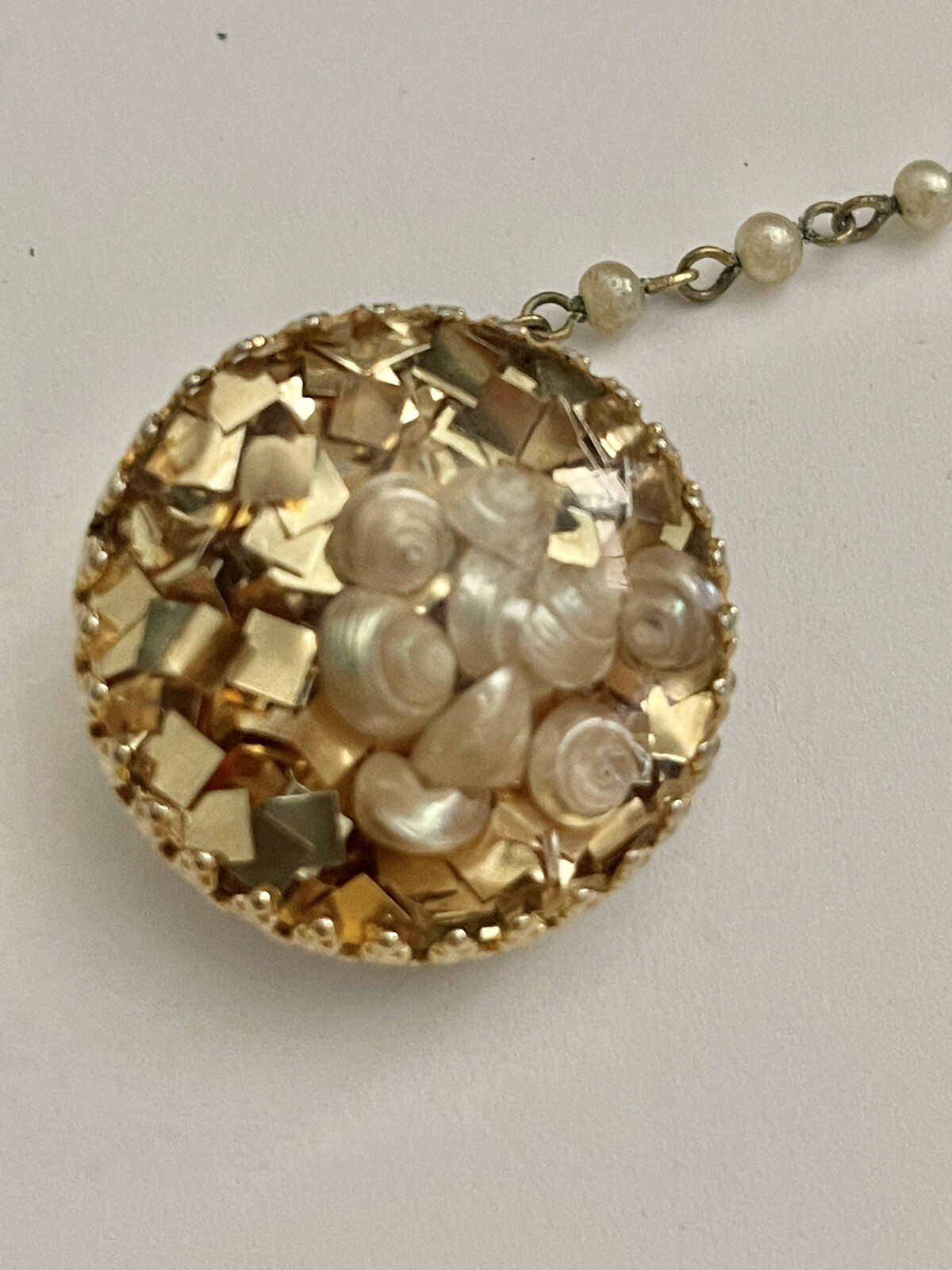 как выглядит Vintage Mid Century Seashells Under Round Lucite Done Sweater Clips фото