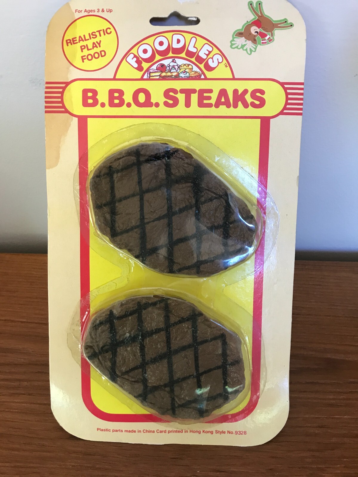 REALISTIC FOODLES TIKES PLAY FUN FOOD 2 BBQ STEAKS QUALITY VINTAGE RARE NEW