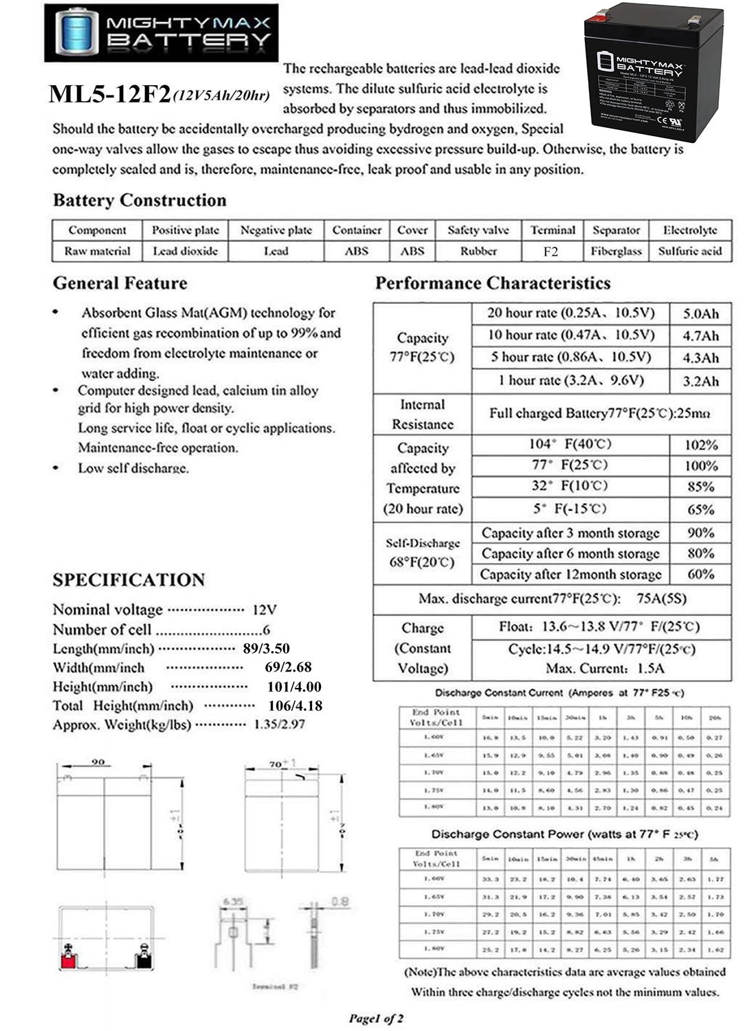 как выглядит Mighty Max 12V 5Ah F2 SLA Replacement Battery for Leoch DJW12-5.0T фото