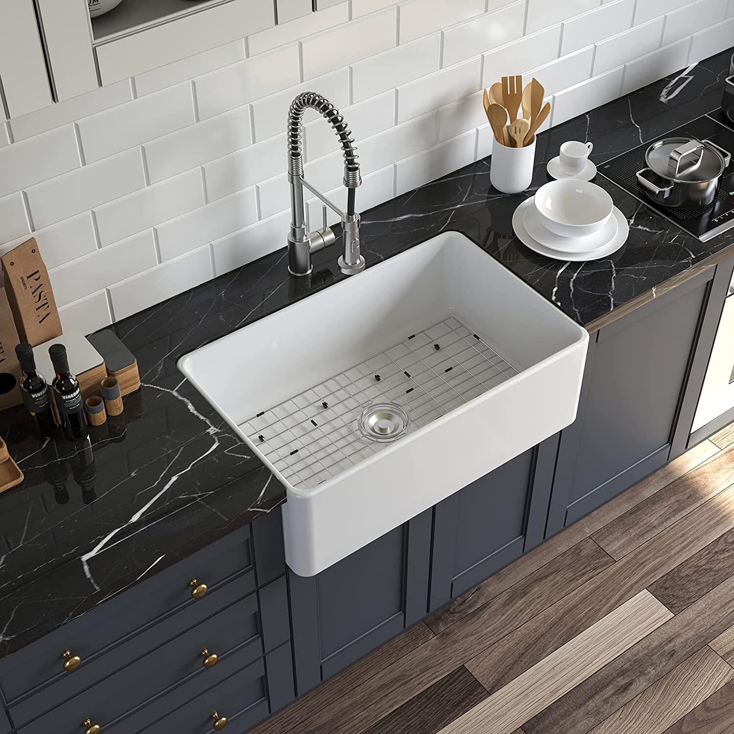 как выглядит 30 x 18 Inch Ceramic Farmhouse Apron Single Basin Kitchen Sink with Strainer фото